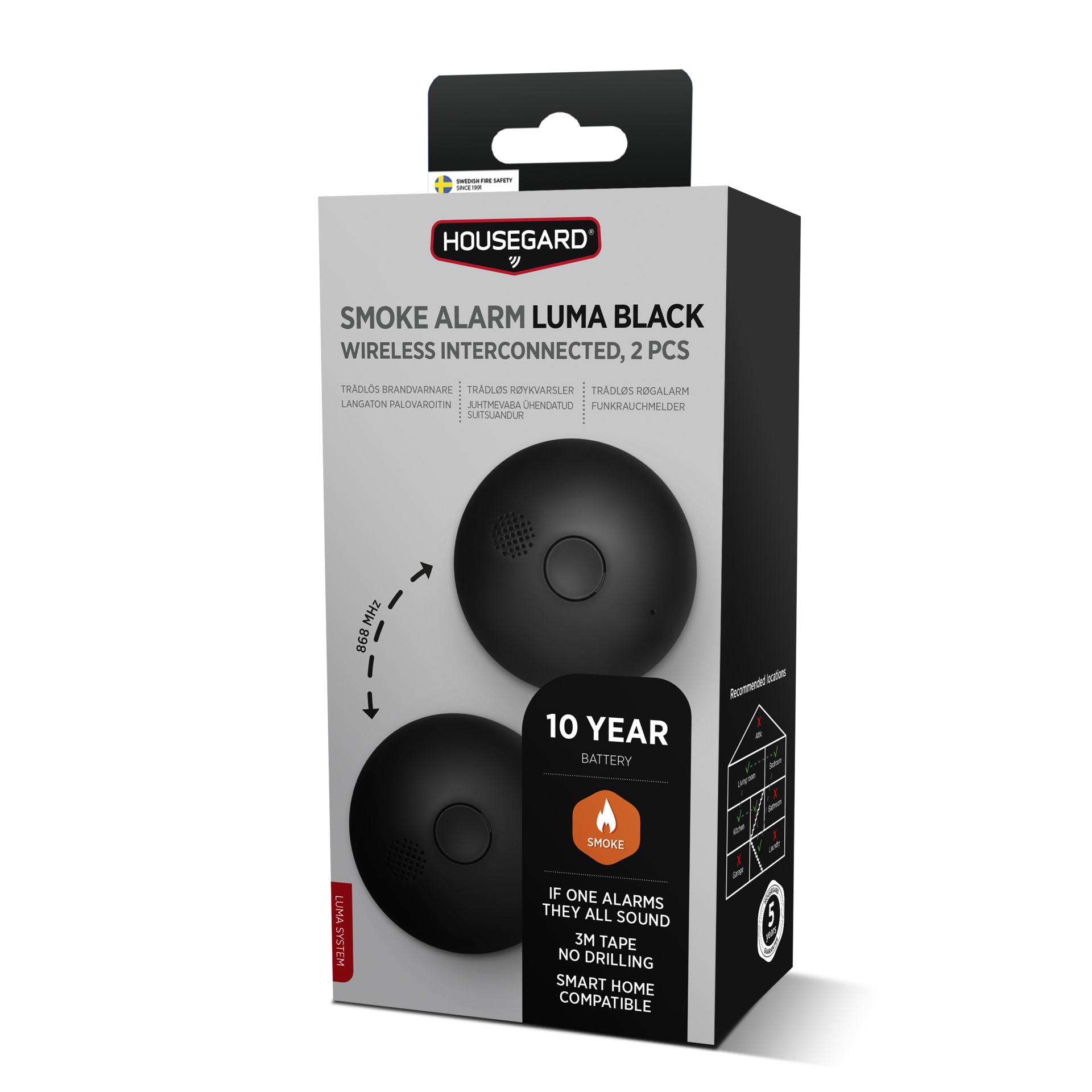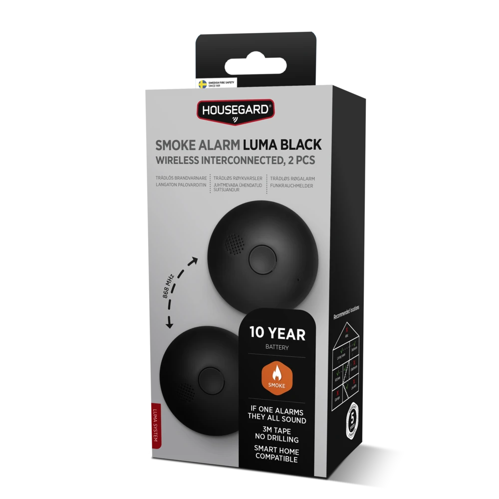 Luma Black er en del af LUMA-systemet, et sammenkoblet brandsikringssystem, der kan udvides efter behov. Røgalarmerne kommunikerer via 868 MHz og kan forbindes med op til 40 enheder. Når én enhed advarer, advarer alle, hvilket skaber en hurtig og effektiv alarmkæde i hele bygningen.