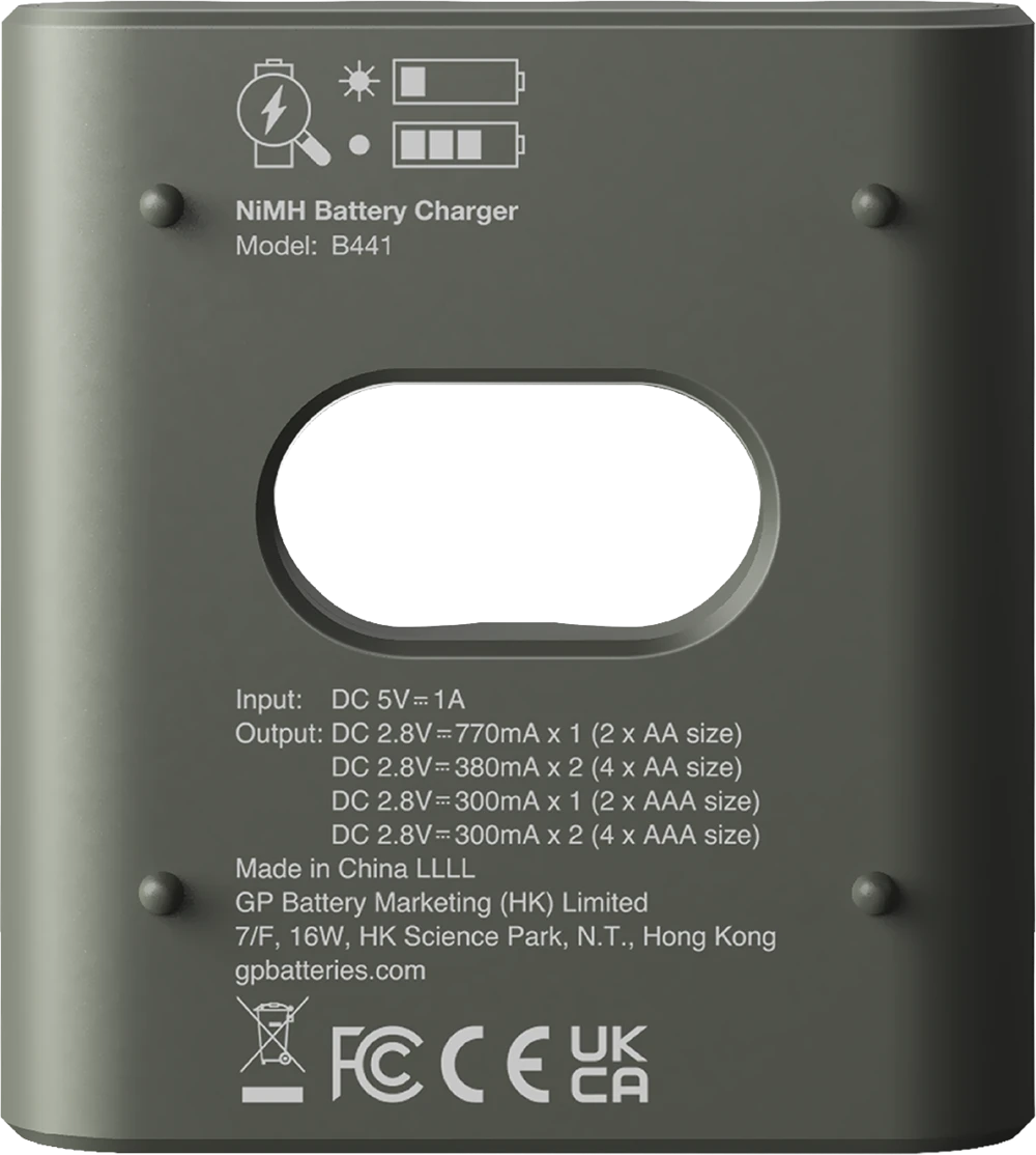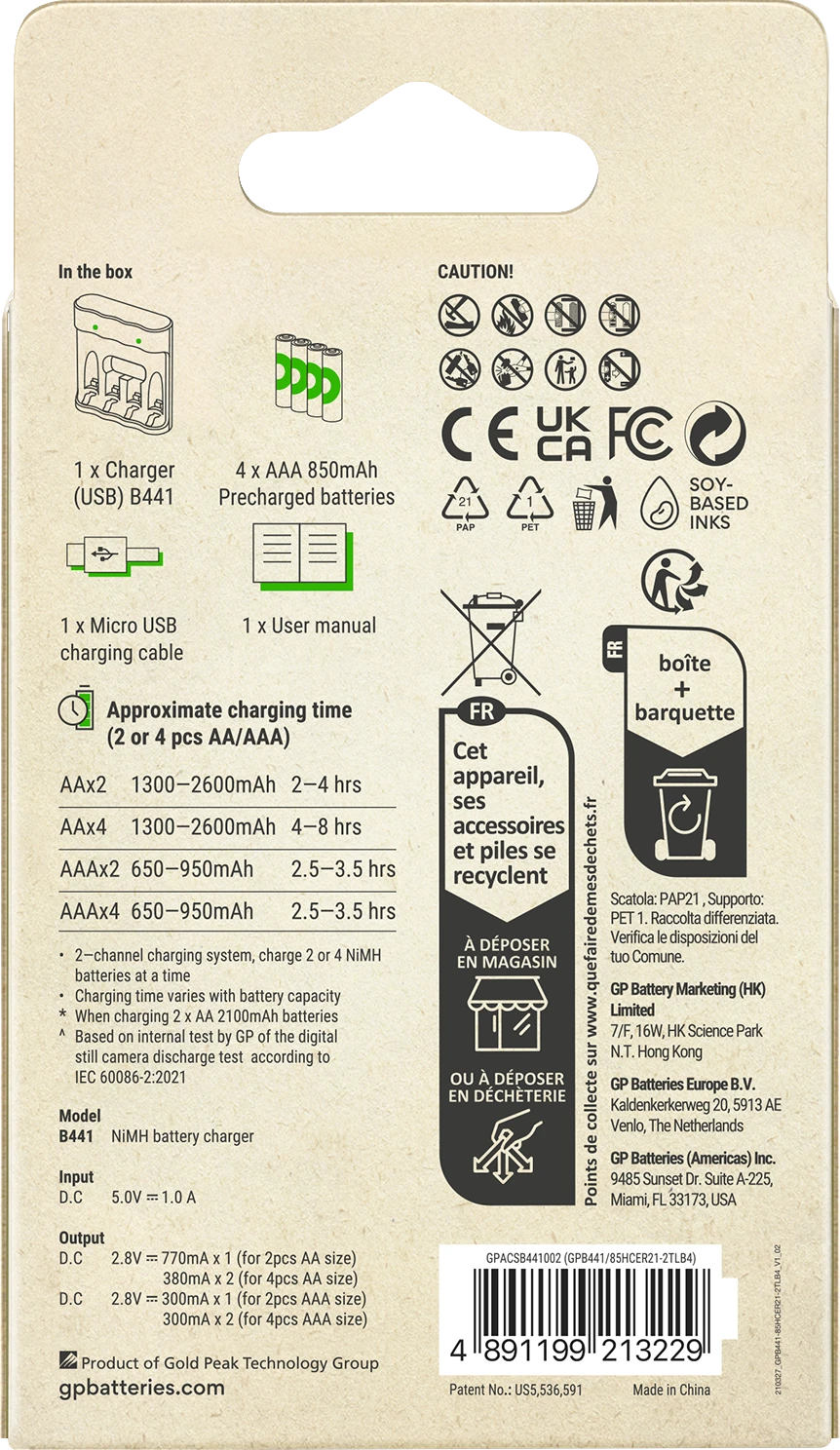 B441 lataa neljä 2100mAh AA-akkua tai neljä 850mAh AAA-akkua 3-6 tunnissa USB-liitännän kautta. LED-merkkivalot näyttävät latauksen tilan ja jos laturiin on asetettu kertakäyttöisiä paristoja tai viallisia akkuja. Toinen turvaominaisuus on automaattinen virrankatkaisuajastin ja täyden latauksen -dV-tunnistus, joka auttaa välttämään ylilatausta, ylijännitettä ja oikosulkua sekä estämään akkujen vioittumista. Tämä monipuolinen laturi toimii USB:n avulla ja minkä tahansa GP Recyko -lataustelakan kanssa. Mukana on neljä ladattavaa AAA 850mAh-akkua täydentämässä optimaalista latausratkaisua.