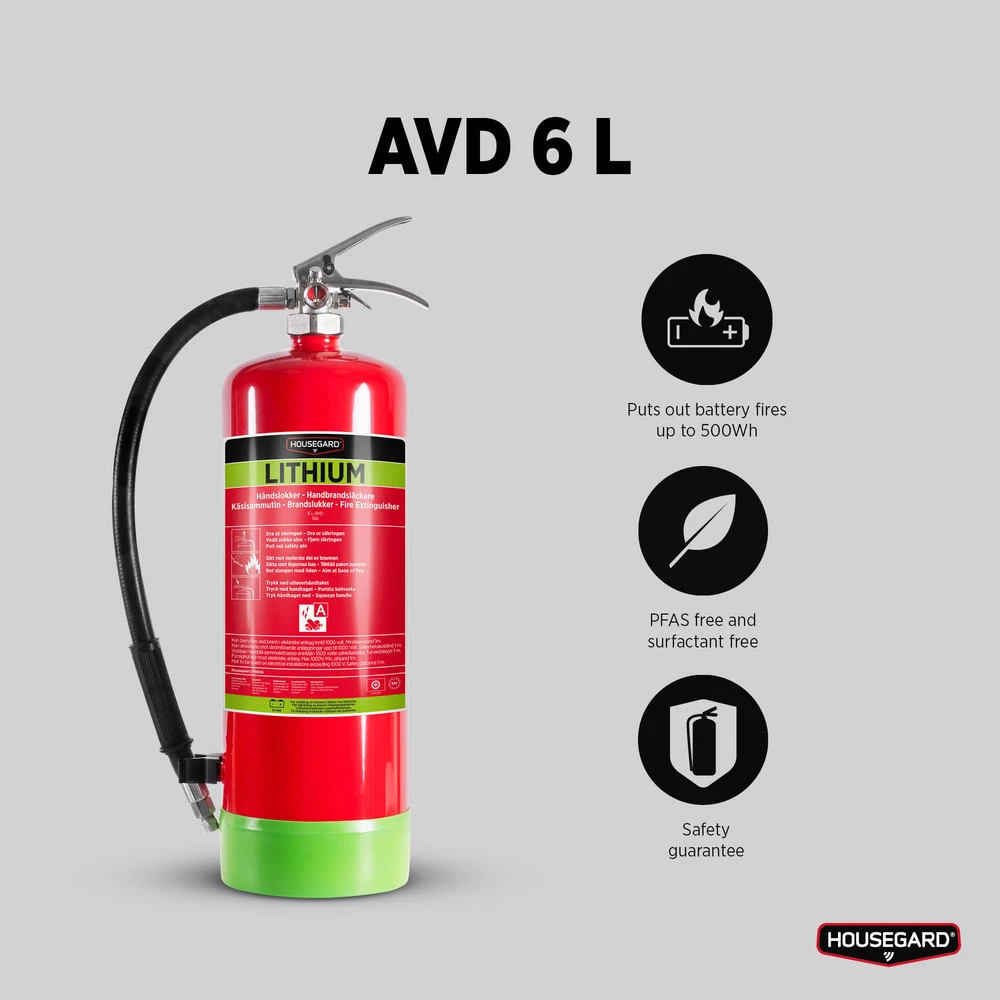 Housegard AVD -sammutin soveltuu litiumioniakkujen ja kiinteiden metallien palojen sammuttamiseen. AVD:n korkea vesipitoisuus jäähdyttää tehokkaasti palopesäkettä. AVD:llä on erinomainen pystysuuntainen tarttuvuus, minkä ansiosta se jäähdyttää myös pystysuoria pintoja, joilta muut sammutusaineet valuvat nopeasti pois ilman merkittävää vaikutusta. AVD muodostaa kerroksen palopesäkkeen päälle, mikä estää hapensaannin ja tukahduttaa tulen nopeasti. Koska vermikuliitti kestää korkeita lämpötiloja, jopa reilusti yli 1000 °C, AVD-kerros pysyy ehjänä myös vaikeimmissa ja kuumimmissa litiumioniakkujen paloissa.