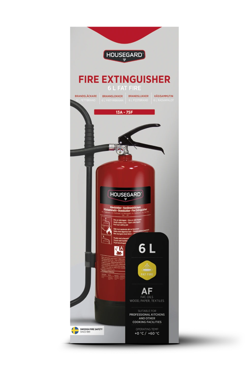 Housegard 6 L rasvapalosammutin on kehitetty torjumaan F-luokan tulipaloja ruoanvalmistuksessa käytetyissä öljyissä. Sammutin on suunniteltu keittiöihin ja tiloihin, joissa käsitellään rasvakeittimiä, paistolevyjä ja suuria määriä ruokaa ja ruokaöljyä. Varsisuutin turvalliseen sammuttamiseen etäällä tulesta.