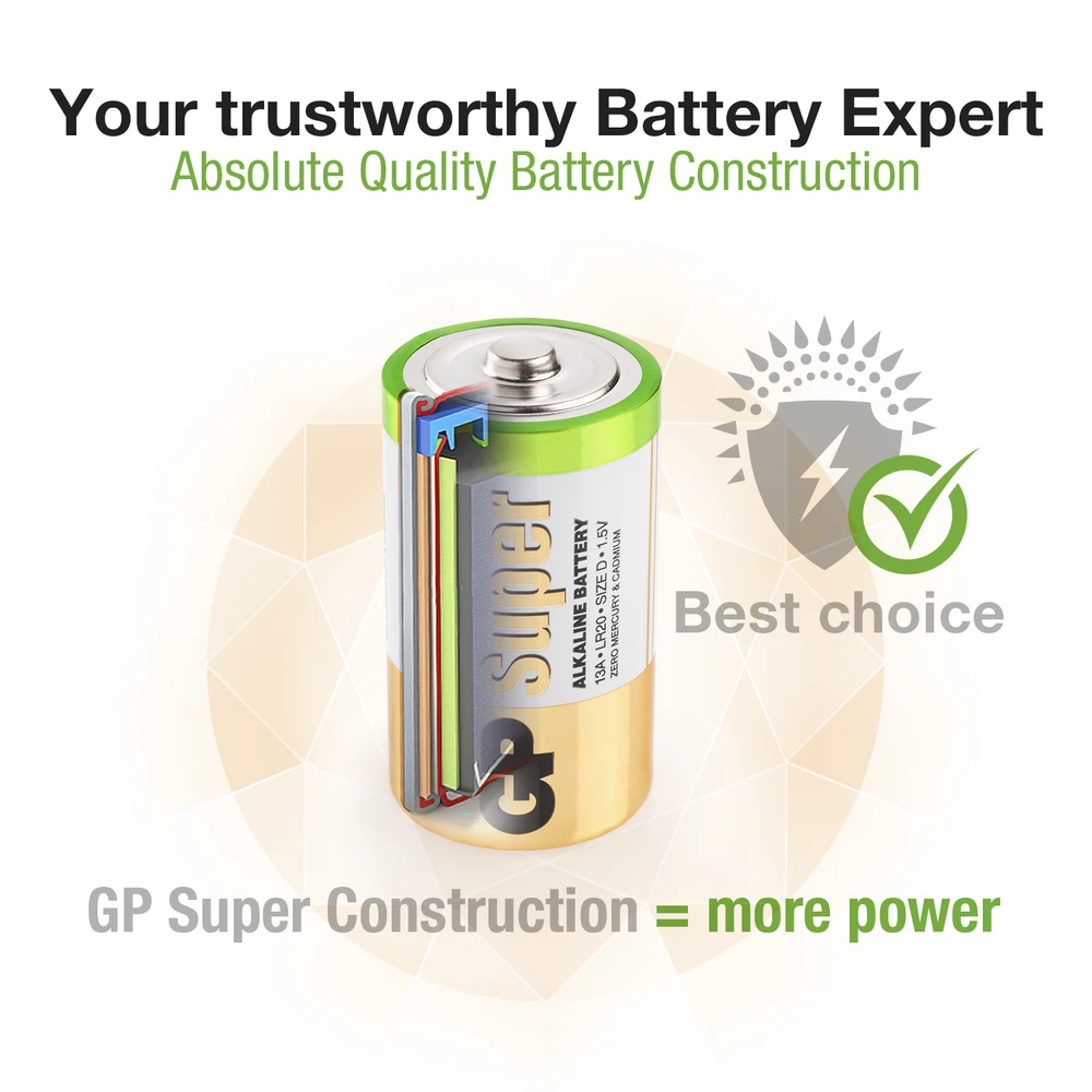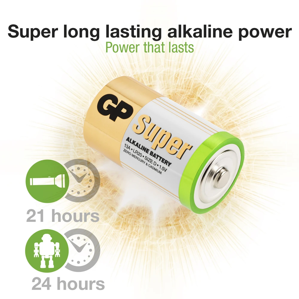 Alkaliparisto, joka on tarkoitettu lähes kaikkiin tuotteisiin, jotka vaativat keskisuurta virtamäärää esim. lelut, seinäkellot, kaukosäätimet ja taskulamput. GP Super Alkaline on kattava tuoteperhe, jonka tuotteita on saatavana sekä bulkki- että blisteripakkauksissa.
