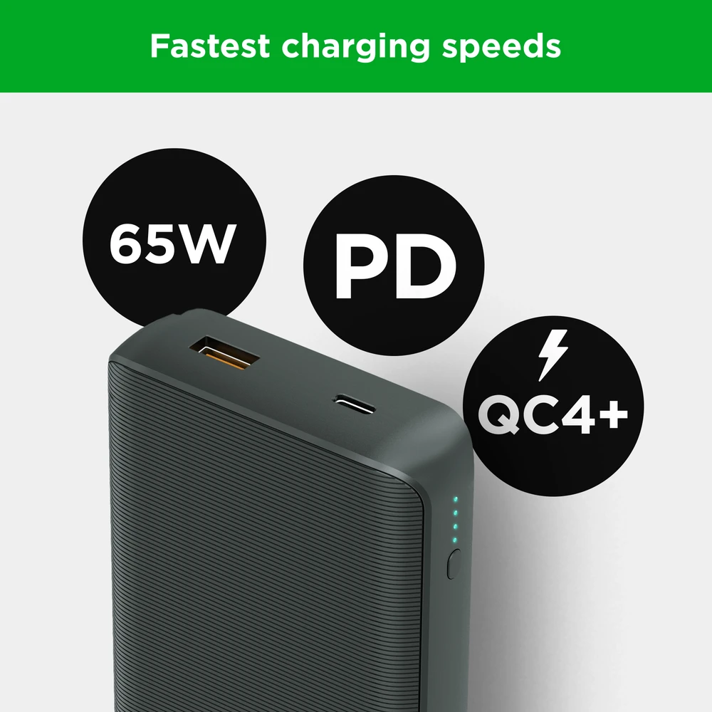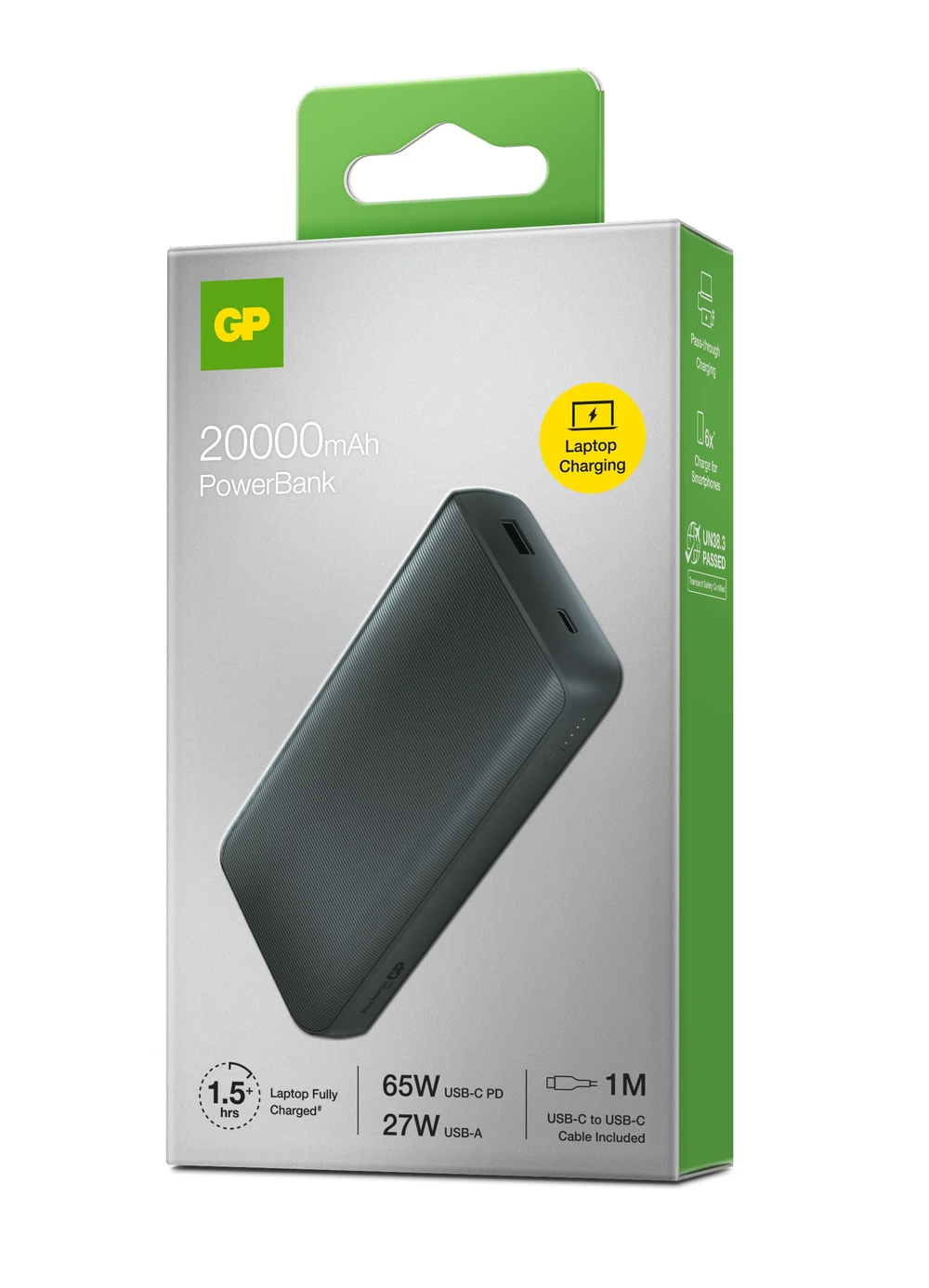 La nouvelle batterie externe T20B de GP est suffisamment puissante pour charger un ordinateur portable (qui se charge par une connexion USB-C) et prend en charge les dernières normes Quick Charge 4+ ainsi que le chargement PD de 65W. Ce qui fait que vous pouvez tout charger, de votre téléphone portable jusqu’à votre ordinateur portable avec la plus courte durée de chargement possible.
