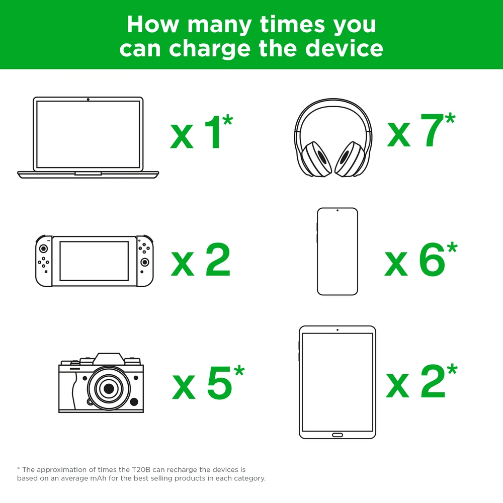 La taille compacte de T20B par rapport à sa puissance vous permet de toutes nouvelles possibilités d’utilisation d’une batterie externe. Que vous chargiez votre ordinateur portable, Nintendo Switch, des écouteurs ou un téléphone portable, T20B réussit à le faire en un temps plus réduit que jamais.