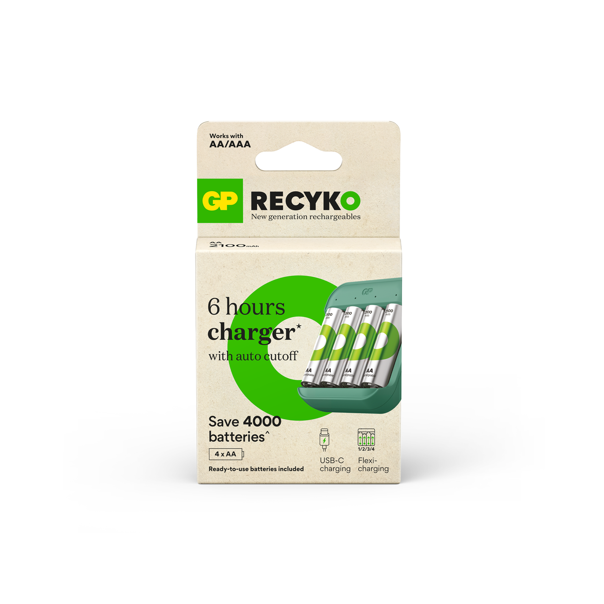 Recharge en 6 heures – L’alimentation intelligente assure une charge rapide en seulement 6 heures pour 1 à 4 piles AA/AAA NiMH via l’entrée USB-C.