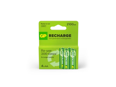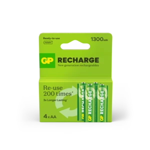 Une puissance qui dure plus longtemps : Les piles rechargeables GP Recharge AA de 1300 mAh durent jusqu’à 3 fois plus longtemps en usage que les piles jetables.