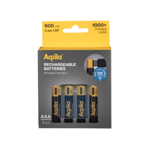 Le batterie ricaricabili USB-C di Aqiila garantiscono energia affidabile ovunque. Niente caricabatterie ingombranti, niente prese da cercare – collega semplicemente il cavo USB-C direttamente alla batteria e ricarica mentre sei in movimento. Le batterie resistono a oltre 1000 cicli di ricarica e offrono prestazioni stabili da -10 °C a +50 °C. La ricarica rapida garantisce che tu non rimanga mai senza energia. Che si tratti di torce frontali, GPS, fotocamere o radio, queste batterie assicurano un funzionamento senza interruzioni dalla giornata lavorativa al campeggio.Per dispositivi più piccoli che richiedono energia affidabile, le batterie AAA ricaricabili USB-C di Aqiila sono la soluzione perfetta. L'uscita reale da 1,5 V garantisce prestazioni stabili, mentre la porta USB-C integrata consente di ricaricare direttamente le batterie – nessun caricatore separato necessario. Ogni confezione da quattro batterie include un cavo di ricarica 4-in-1 e una custodia da viaggio, perfetta da mettere nello zaino. Completamente cariche in solo 1,5 ore e testate per oltre 1000 cicli di ricarica, sono la soluzione leggera e sempre pronta per l’energia in movimento.