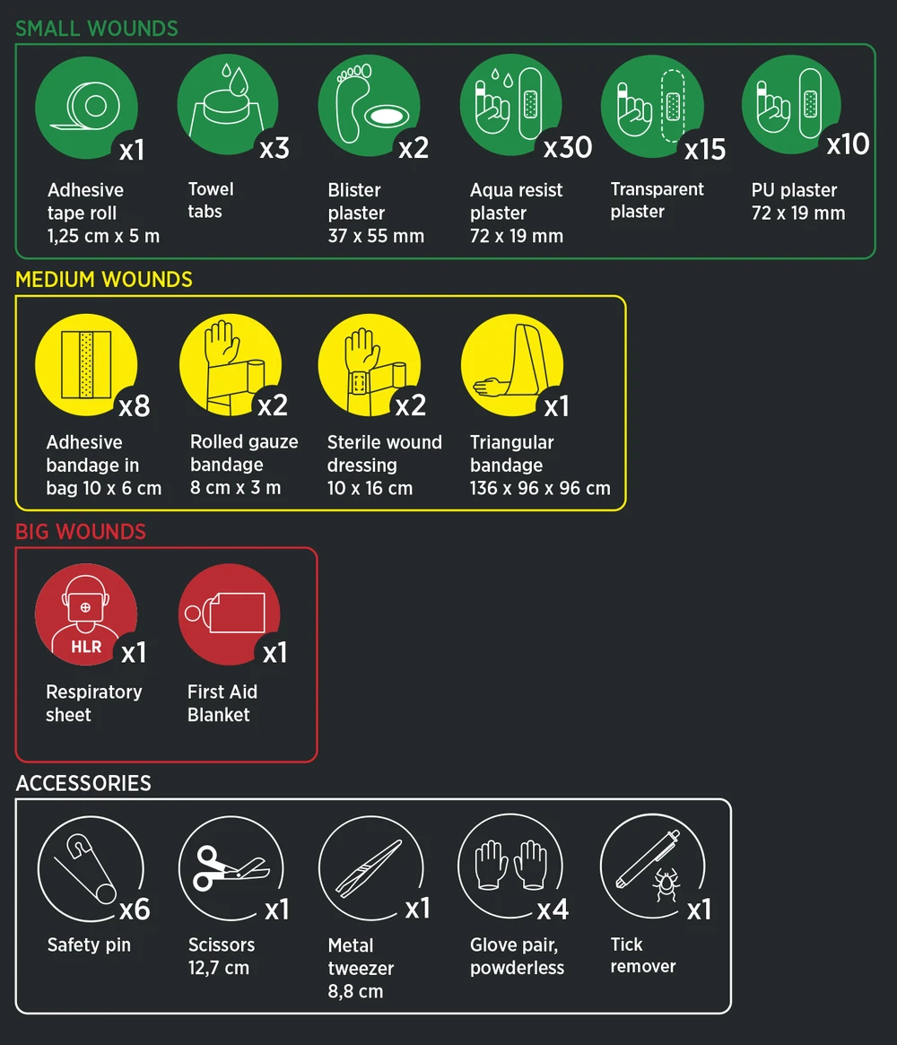 - Inneholder det viktigste for å håndtere små og middels store sår