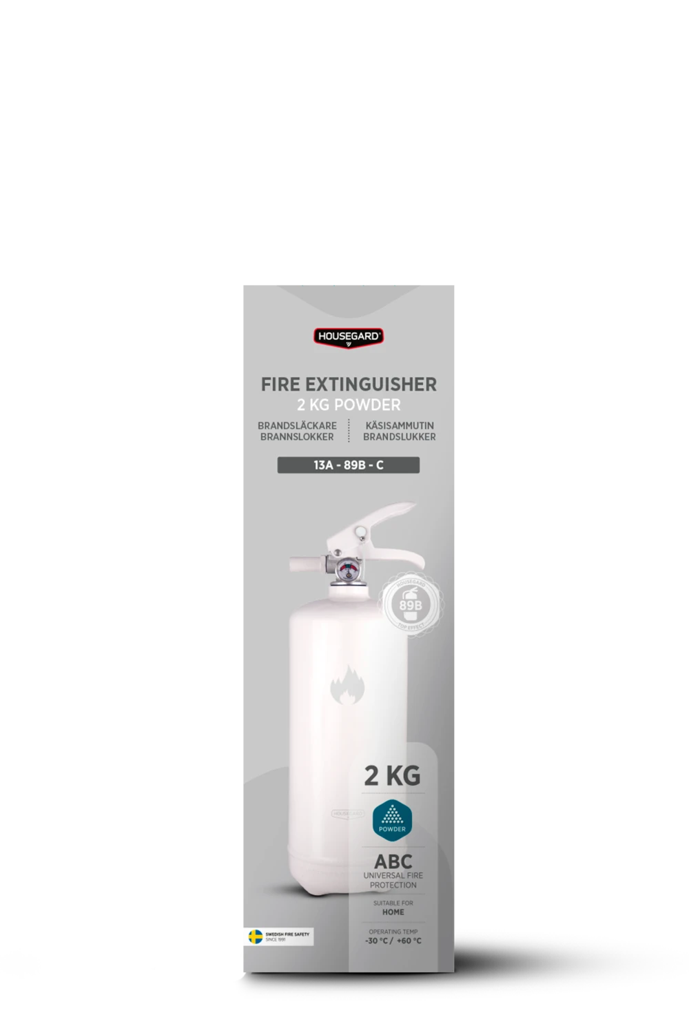 Vi har utformat våra produktförpackningar till att vara både informativa för slutkonsument, men även optimerade för butiksexponering. På våra förpackningar hittar du enkelt information om effektivitetsklass och användningsområde för respektive brandsläckare.