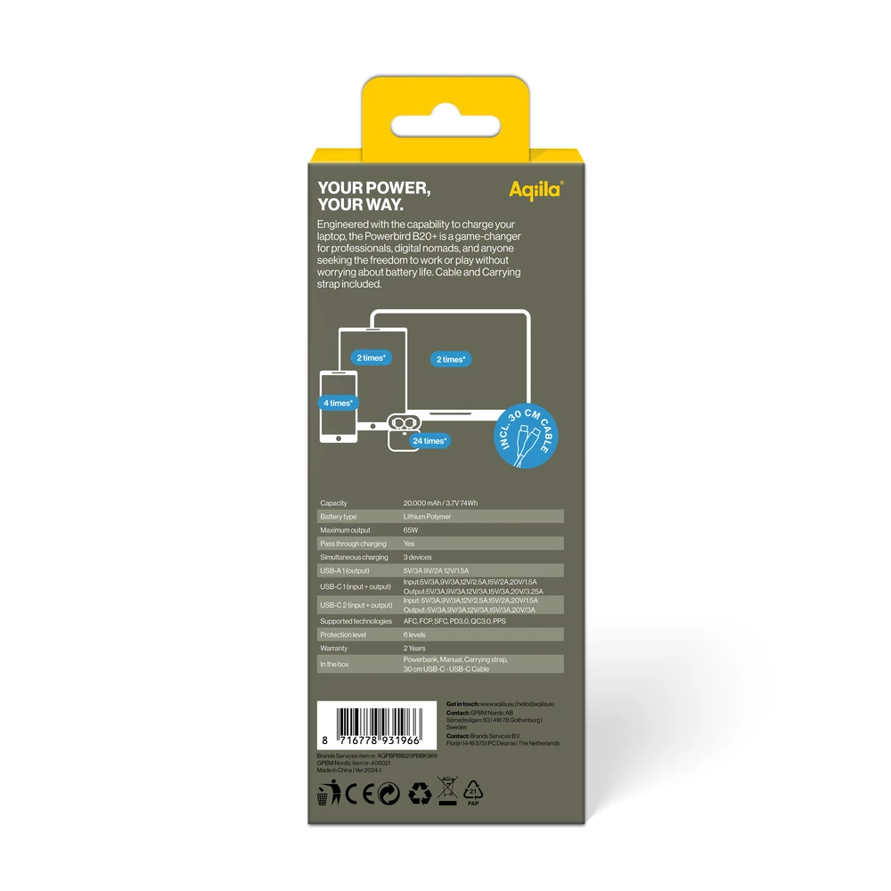 Powerbird B20+ är en kraftfull och snabb powerbank som kan ladda allt från din telefon till din bärbara dator. Powerbird B20+ kan ladda de flesta telefoner fyra gånger.