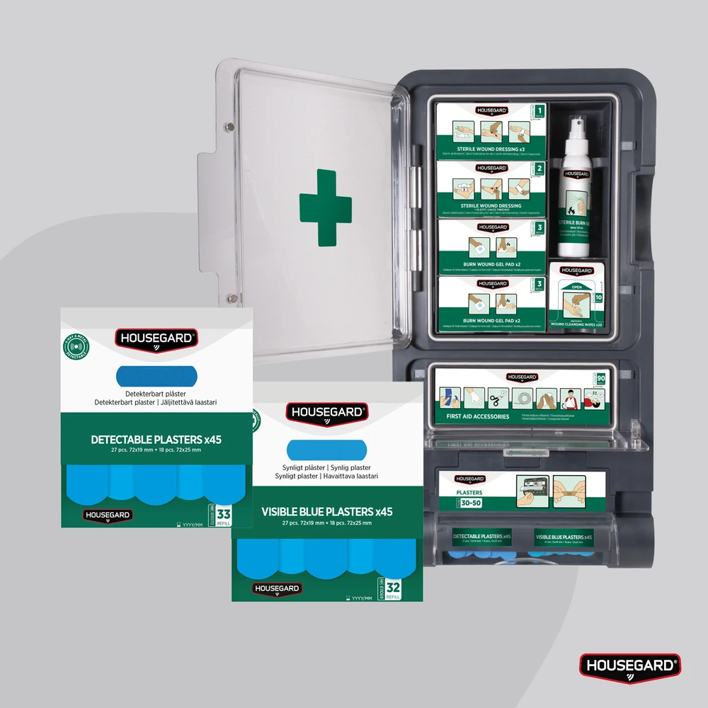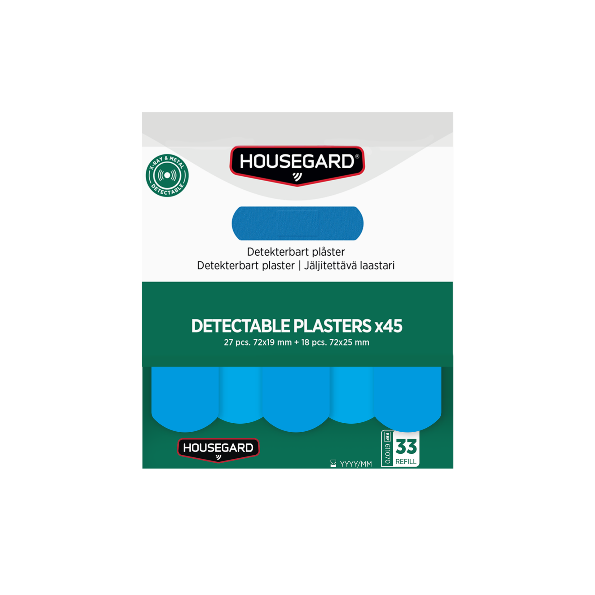 Blå detekterbara plåster med inbyggd metallremsa som upptäcks av metalldetektorer. Utvecklade för livsmedelsproduktion och andra miljöer där hög hygiennivå krävs. Tillverkade i vattentåligt, slitstarkt material. Levereras som refill till Housegards och andra första hjälpen-stationer.
