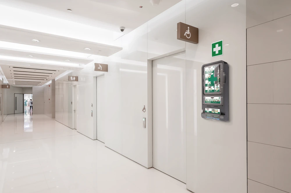 En komplett första hjälpen-station med utrustning för både sårvård och brännskador. Stationen är överskådlig och lättåtkomlig, med en lucka försedd med gummilist som skyddar mot damm, fukt och smuts.