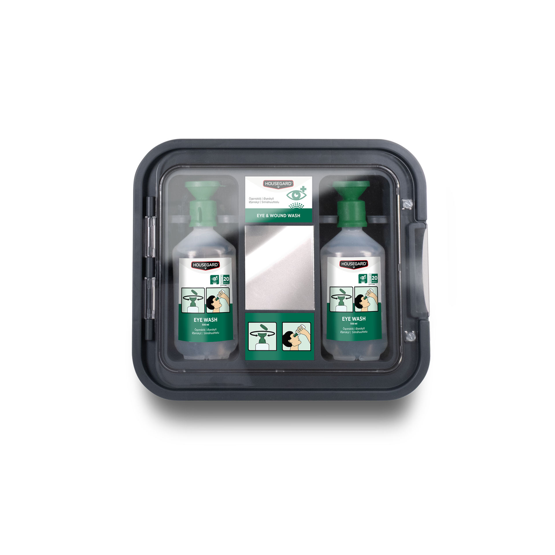 En station särskilt framtagen för ögonskador, utrustad med två flaskor ögonskölj på 500 ml. Stationen är lättöverskådlig och snabb att använda, med en lucka försedd med gummilist som skyddar innehållet mot damm och smuts. I mitten finns en spegel som underlättar för användaren att själv skölja ögat effektivt.