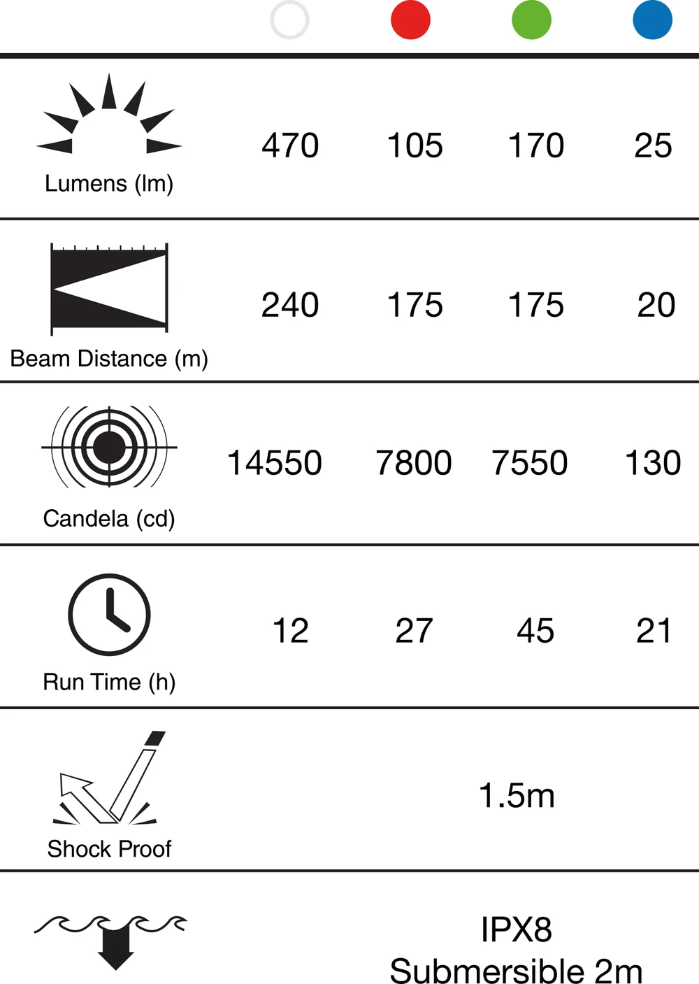 Kraftigt lys som når 240 meter frem. Til ekstra krævende behov udendørs. Hvidt, rødt, blåt og grønt lysskær for nattesyn, sporing af dyr og kortlæsning. Genopladelig. Vandtæt. Holdbar og robust konstruktion.