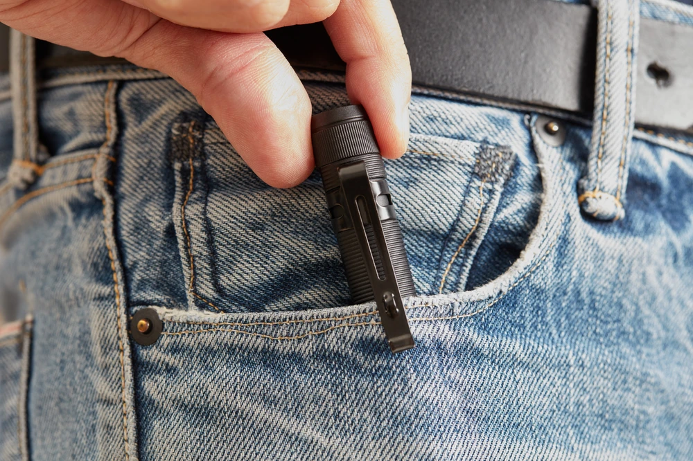 En lille og kompakt lommelygte med slidstærkt anodiseret aluminiumshus. Lygten tændes og slukkes med et enkelt tryk på knappen i enden, og metalclipsen på siden gør det nemt at fastgøre den på tøj m.m.