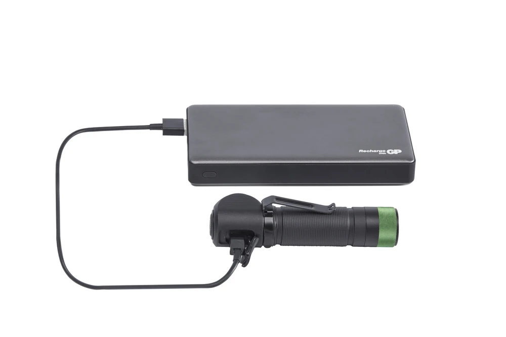 Tag lampen af, så bliver den til en lommelygte. Kraftigt lysskær som når 130 meter frem. Genopladelig. Magnetholder på den korte ende.