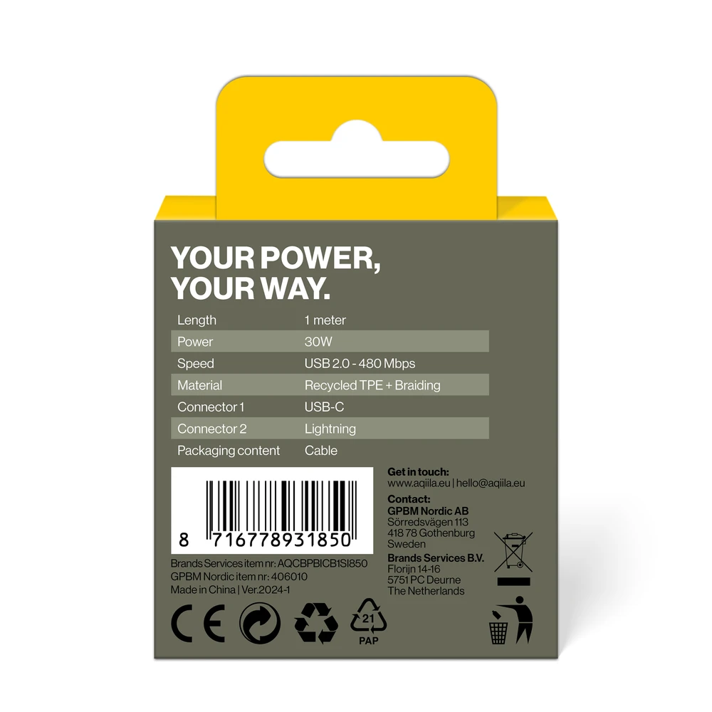 Aqiila Cablebird CB21 kabel USB C til Lightning 30W flettet 1m