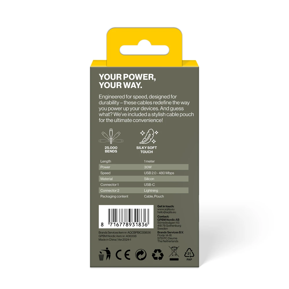 Aqiila Cablebird CS21 kabel USB C til Lightning 30W silikone 1m
