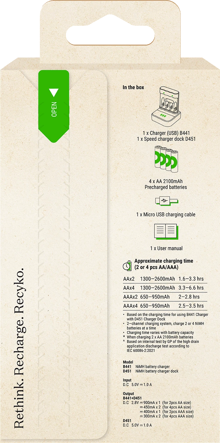 GP Recyko Everyday akkulaturi B441 lataustelakalla D451 (USB), sis. 4 x AA 2100mAh NiMH -akut
