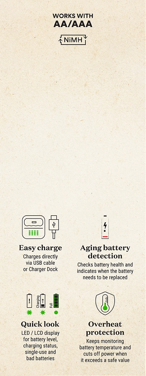 Kompakti laturi älykkäillä turvaominaisuuksilla lataa tehokkaasti jopa neljä AA- tai AAA-akkua kerralla. Mukana D451-lataustelakka, joka tarjoaa tärkeimmät akkutiedot ja tekee lataamisen helpommaksi kuin koskaan ennen.