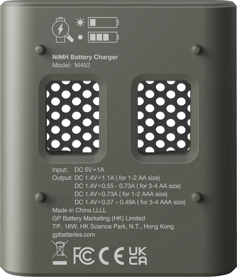 M452-laturilta kestää runsaat 2 tuntia kahden akun täyslataukseen tai vastaavasti 4 tuntia neljän akun (AA 2600mAh) täyslataukseen USB-liitännän kautta. Kaksiväriset LED-valot osoittavat lataustilan sekä sen, onko laturiin on asetettu kertakäyttöisiä paristoja tai kelvottomia akkuja. Toinen turvaominaisuus on automaattinen virrankatkaisuajastin ja täyden latauksen -dV-tunnistus, joka auttaa välttämään ylilatausta, ylijännitettä ja oikosulkua sekä estämään akun voittumista.