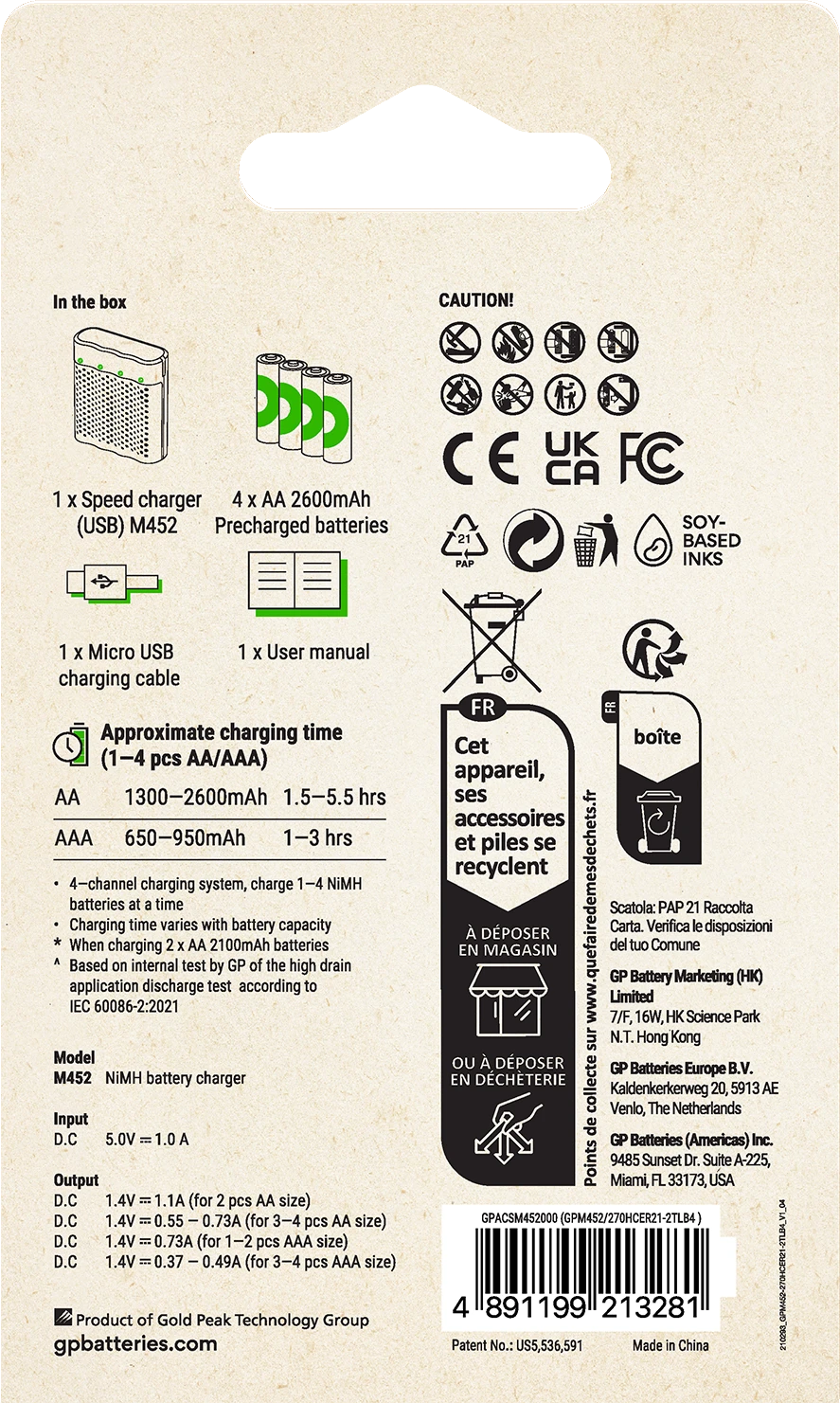 GP Recyko Speed akkulaturi M452 (USB), sis. 4x AA 2600mAh NiMH -akut
