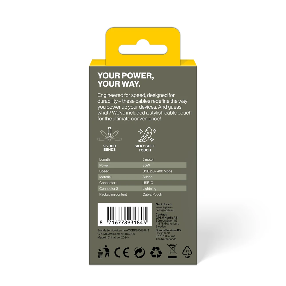 Aqiila Cablebird CS22 kaapeli USB-C to Lightning 30W silikoni 2m