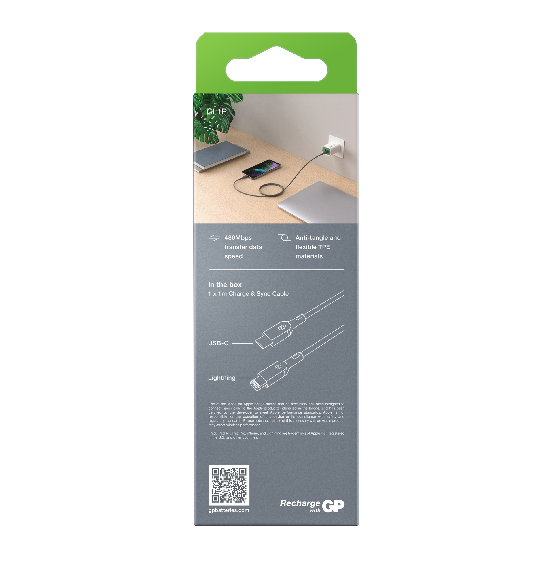 GP Charge & Sync -kaapeli on täydellinen kaapeli päivittäiseen käyttöön. Kaapeli on valmistettu joustavista materiaaleista, joiden ansiosta kaapeli kestää venytystä ja taivutusta yli 10 000 kertaa rikkoutumatta. Se lataa älypuhelimen 50 %:iin vain 30 minuutissa*. Se tukee PD-latausta ja maksimiteho on 20 W, joten se on yhteensopiva useiden sovellusten kanssa. Kaapeli tukee kaikkien tiedostotyyppien nopeaa 480 Mbps siirtoa, tiedot voidaan siirtää hetkessä.