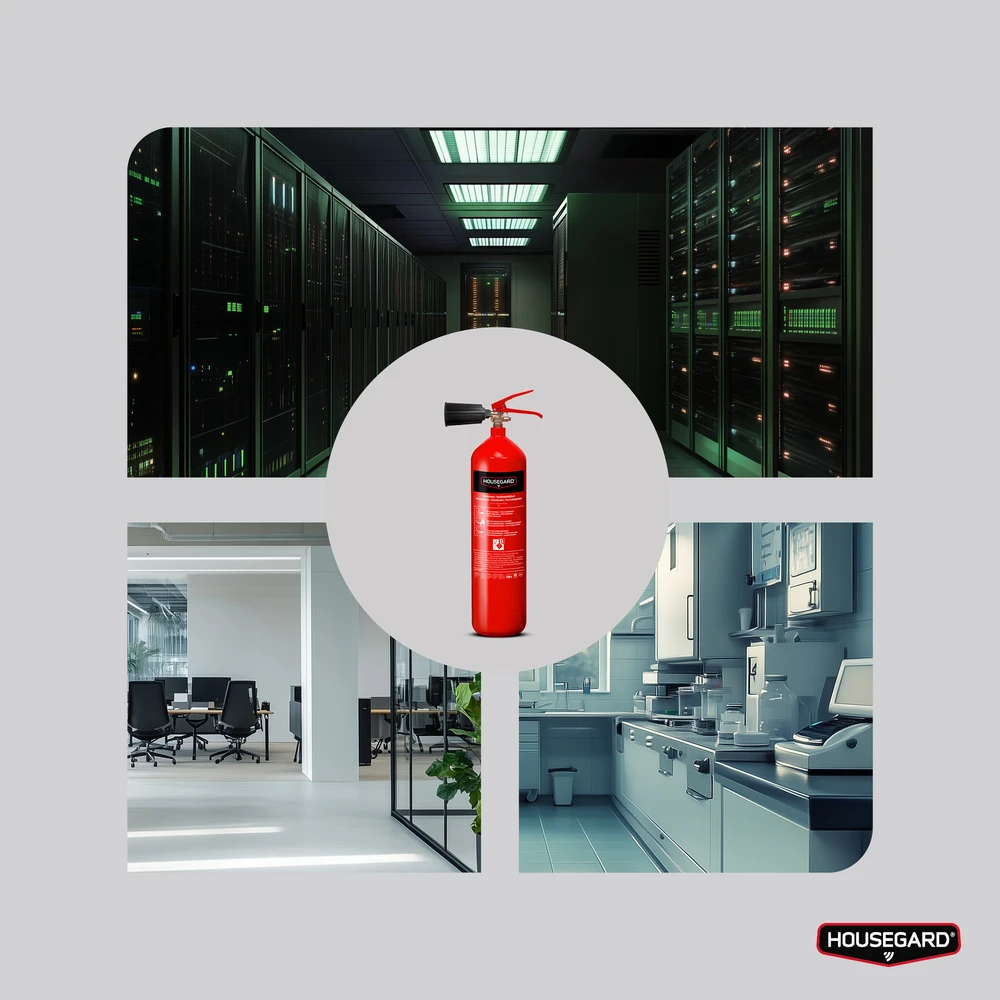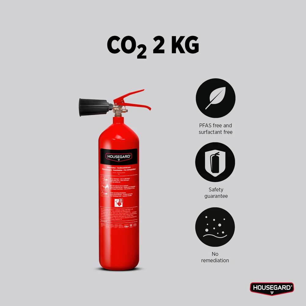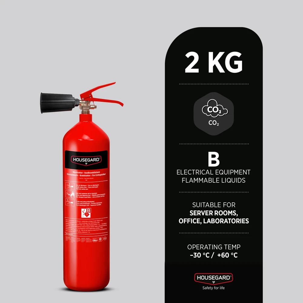 Housegard 2kg hiilidioksidisammutin sammuttaa sähköpaloja mutta soveltuu myös nestepaloihin. Hiilidioksidisammutin tukahduttaa palot puhtaasti, joten jälkisiivous on helpompaa. Hiilidioksidisammutin soveltuu sähköhuoneisiin, serverikeskuksiin, konttoreihin ja julkiselle sektorille, kuten esim. sairaalat. Seinäkiinnike sisältyy.