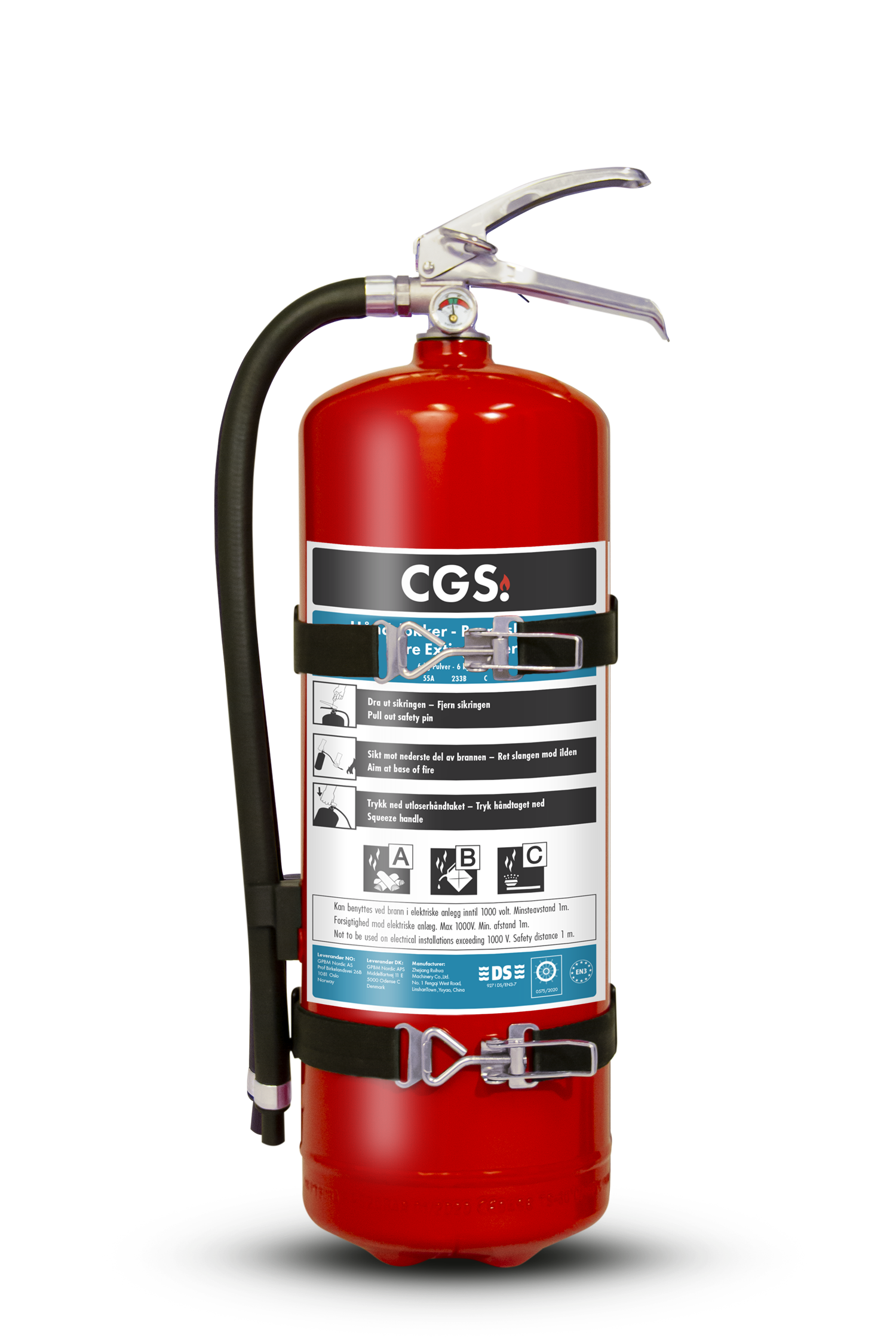 CGS-jauhesammutin on tehokas A-, B- ja C-luokan palojen sammuttamisessa.
