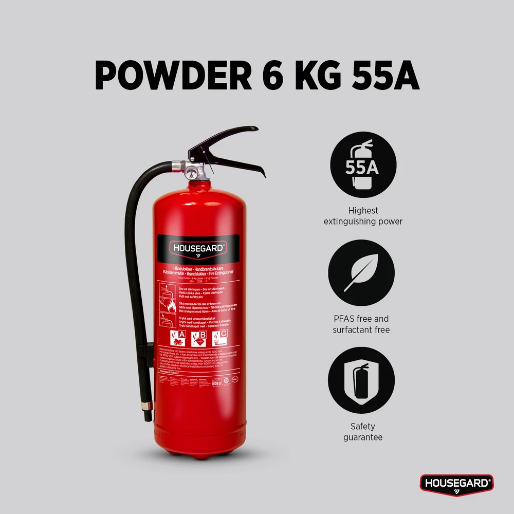 Housegard 6 kg jauhesammutin 55A 233B C soveltuu kaikentyppisten palojen sammutukseen. Jauhesammutin on suositeltavin valinta omakotitalossa, huvilassa, huoneistossa ja loma-asunnossa, mutta sopii myös käytettäväksi teollisuudessa ja toimistoissa sekä kuljetus- ja rakennuskoneissa.