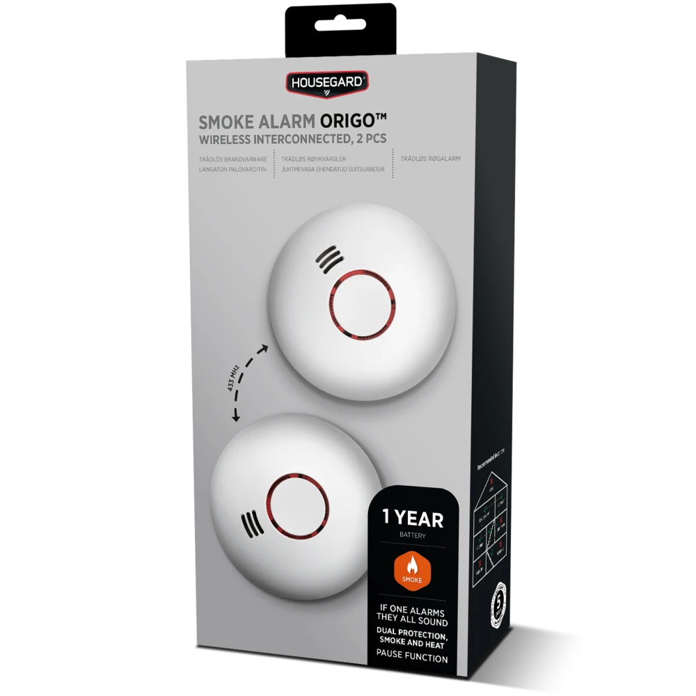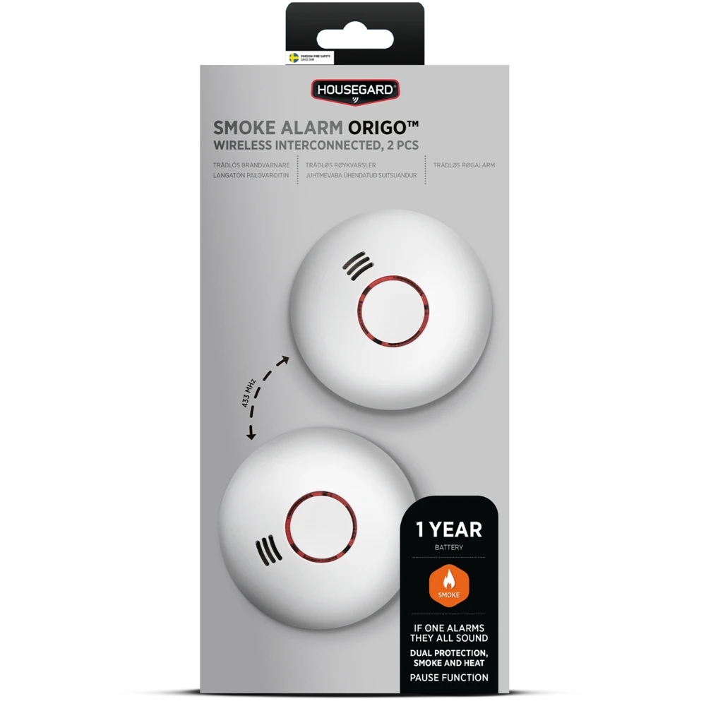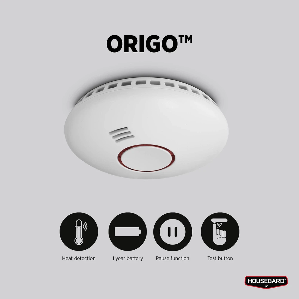 Housegard Origo on langaton, sarjaan liitettävä yhdistetty palo- ja lämpövaroitin. Origo käyttää viimeisintä energiansäästöteknologiaa, joka tarjoaa jopa 12 kuukauden akunkeston vain kahdella AA-paristolla.