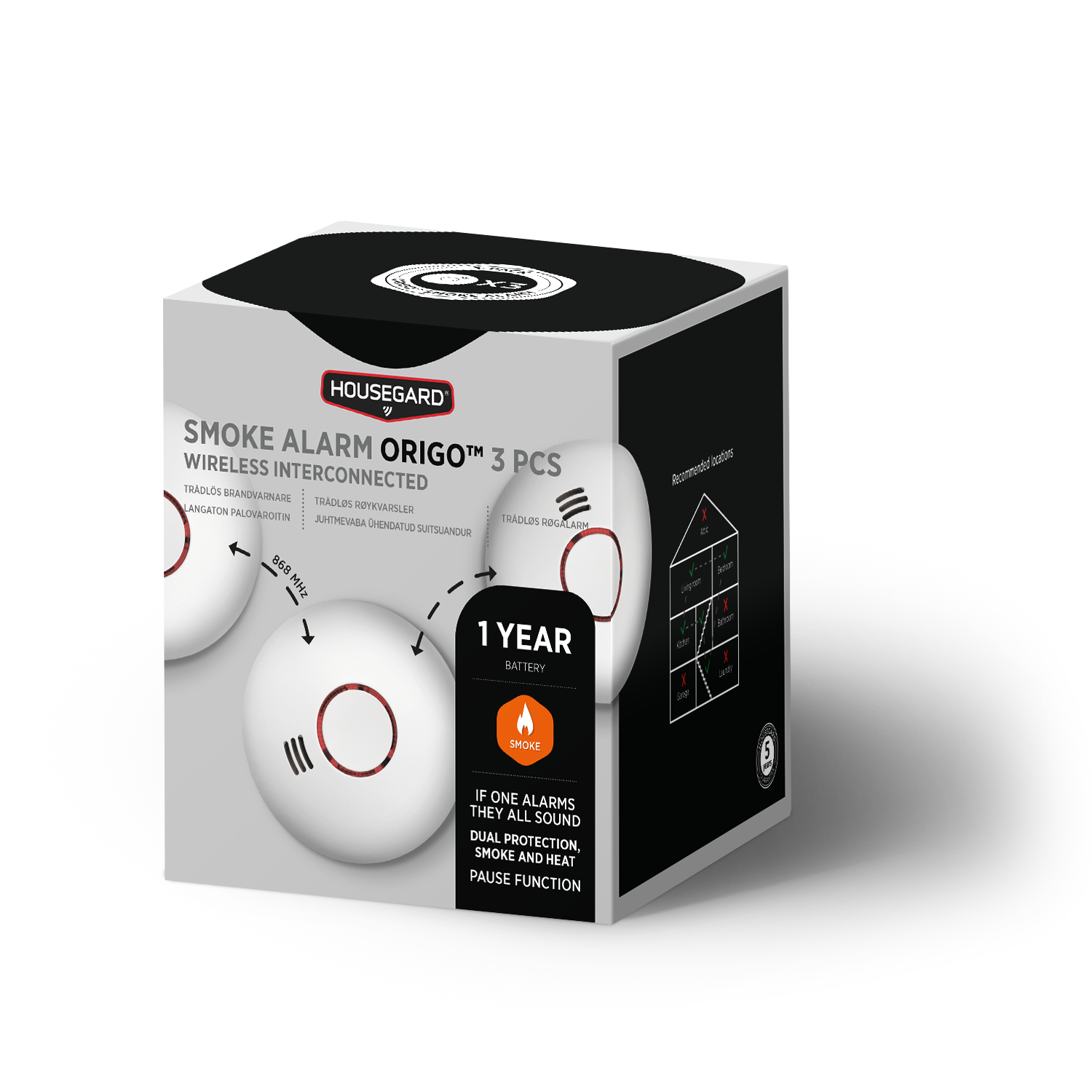 Origo™ on yhdistetty savu- ja lämpövaroitin, joka tarjoaa lisäsuojaa, sillä se havaitsee ja hälyttää savun lisäksi myös äärilämpötiloissa. Sisäänrakennetun paikannustoiminnon avulla voit kuulla mikä palovaroitin on hälyttänyt. Taukotoiminnolla voit helposti hiljentää hälytyksen, jos ei-toivottu hälytys tapahtuu. Varoituksissa on myös yksinkertainen testitoiminto, jossa LED-valo vilkkuu normaalin käytön aikana.| Hälytyssignaali | ≥ 85 dB / 3 m |