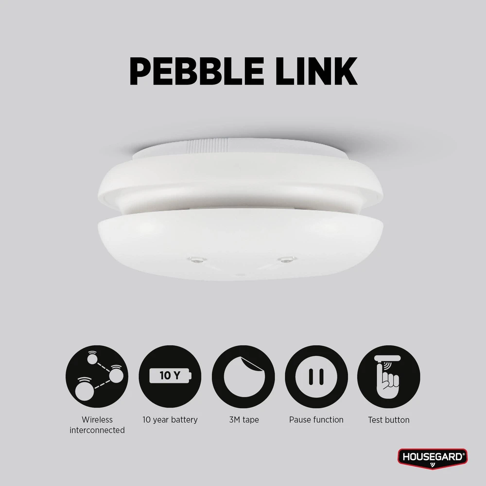 Pebble Link on ketjutettava palovaroitin, joka voidaan liittää jopa 12 laitteeseen. Hälyttää yksi, hälyttää kaikki – näin sinua varoitetaan missä tahansa, kun mahdollinen tulipalo syttyy. Pebble Link sisältää suljetun litiumakun, joka kestää palovaroittimen koko 10 vuoden käyttöiän, mikä on lisäturvatekijä, koska sinun ei tarvitse koskaan ajatella pariston vaihtoa. Hälytin antaa signaalin, kun paristo on lopussa ja on aika vaihtaa palovaroitin uuteen.| Hälytyssignaali | ≥ 85 dB / 3 m |