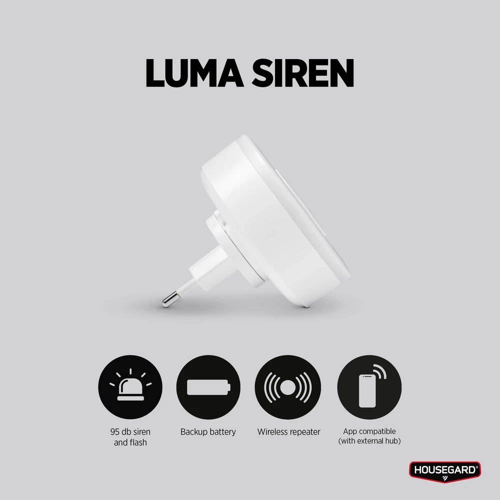 Langaton sireenimme Luma-sarjassa tarjoaa kaksoisvaroitukset tehokkaalla 95 dB sireenillä ja vilkkuvalla valolla, täydellinen henkilöille, joilla on kuulo- tai näkövamma. Langaton toistin pidentää Luma-järjestelmän kantamaa ja välittää muita hälytyssignaaleja. Sireeni toimii sekä Luma Hubin kanssa että ilman sitä.