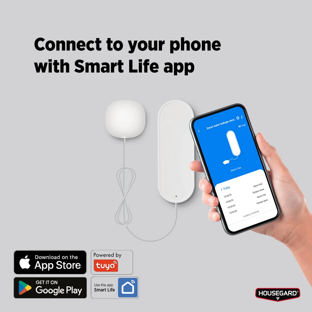 Housegard-älykäs vesivuotohälytin varoittaa nopeasti ja tehokkaasti vuotavista vesijohdoista, tiskikoneista ja pesukoneista. Voidaan käyttää myös kylpyhuoneissa ja tiskikaapeissa. Havaitsee vesivuodot aikaisessa vaiheessa ennen kuin vuoto aiheuttaa suuria vahinkoja. Yksinkertainen tapa estää vesivahingot. Saat hälytyksen puhelimeesi vesivahingon sattuessa tai akun ollessa vähissä. Tuettu sovellus: Smart Life – Smart Living.
