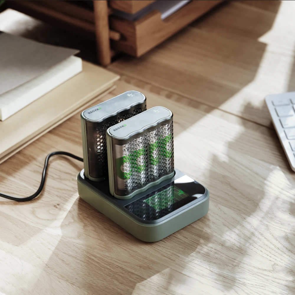 D851-lataustelakka saa virtansa USB-yhteyden kautta ja sen ainutlaatuinen tilaa säästävä muotoilu pitää jopa kaksi Recyko-akkulaturia pystysuunnassa (lataa jopa kahdeksan akkua kerralla). Tuloksena on ihanteellisen ratkaisu koti- ja toimistokäyttöön. Kun laturit on kytketty, telakan nestekidenäyttö ilmaisee kunkin akun lataustilan ja ja käyttöasteen, muistuttaen sinua siitä, milloin vanhat akut tulisi vaihtaa.