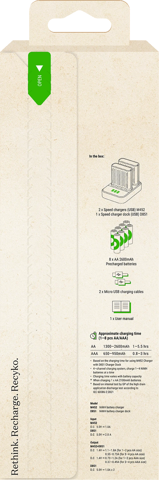 GP Recyko 2x Speed -laturi M452 (USB) lataustelakalla D851, sis. 8x AA 2600mAh NiMH -akut