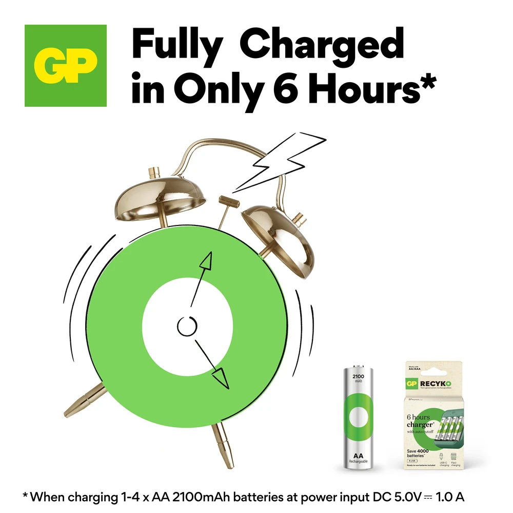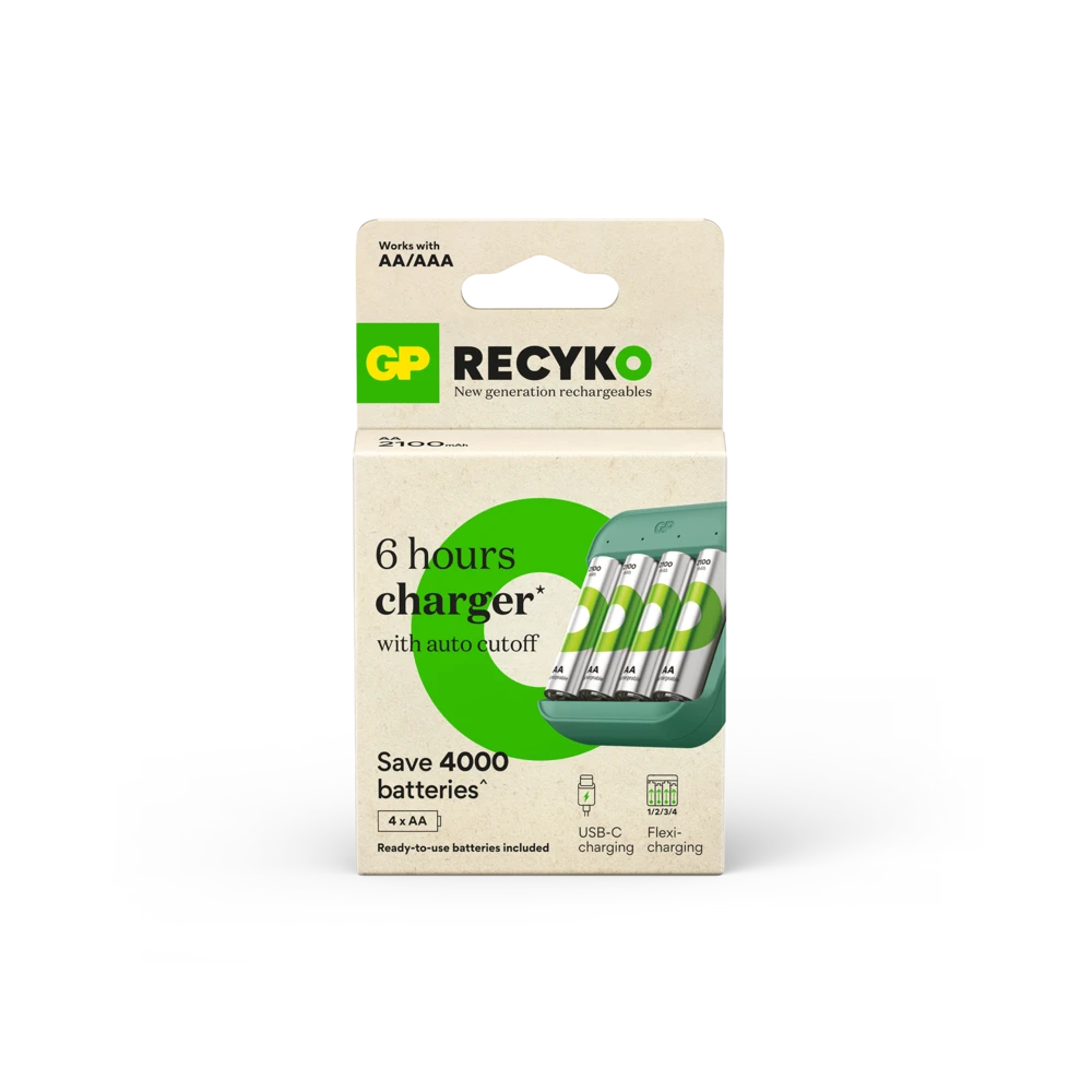Lataa 6 tunnissa – Älykäs ja kompakti laturi, joka lataa jopa neljä AA- tai AAA-akkua nopeasti vain 6 tunnissa USB-C-liitännällä.