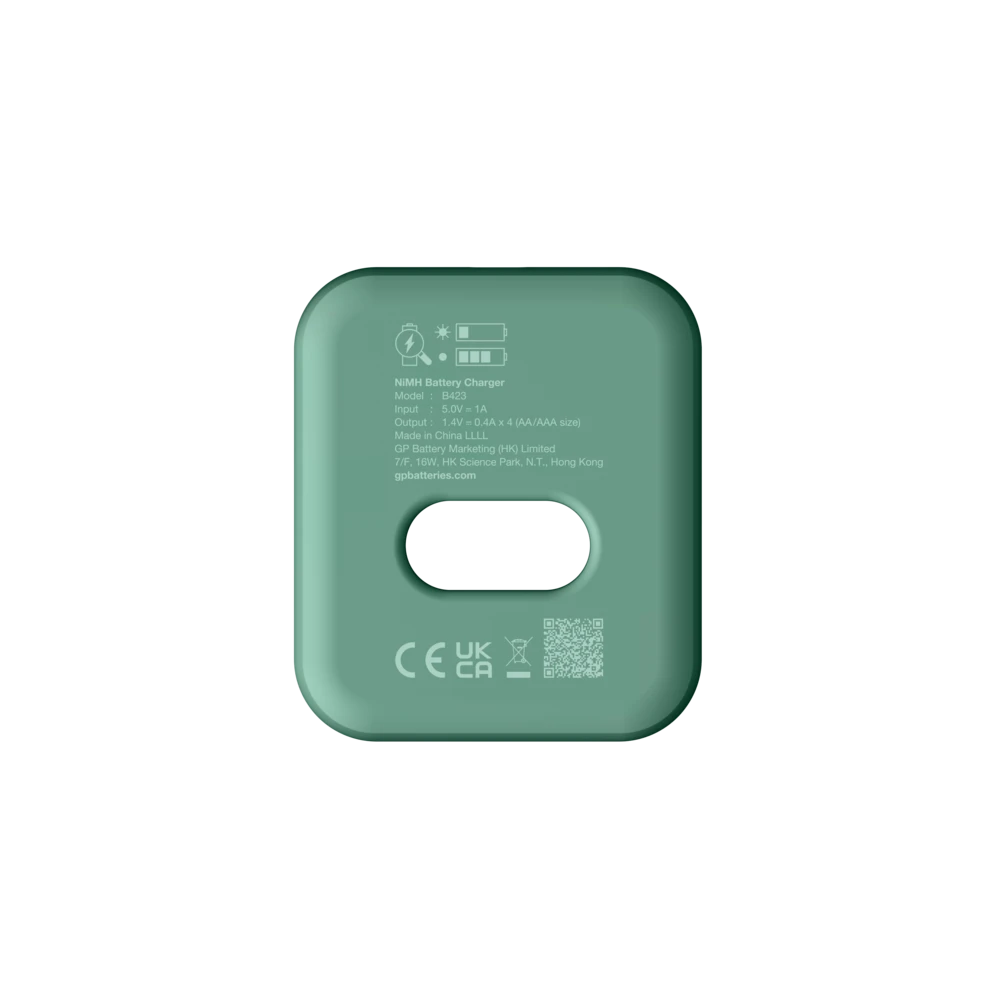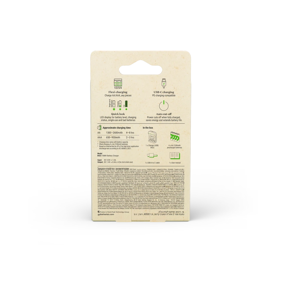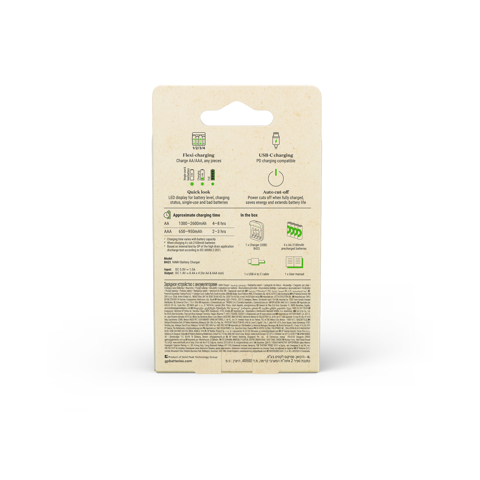 B423 lataa AA/AAA -akkut noin 6 tunnissa USB-C -liitännän kautta. LED-merkkivalot näyttävät latauksen tilan ja jos laturiin on asetettu kertakäyttöisiä paristoja tai viallisia akkuja. Toinen turvaominaisuus on automaattinen virrankatkaisuajastin ja täyden latauksen -dV-tunnistus, joka auttaa välttämään ylilatausta, ylijännitettä ja oikosulkua sekä estämään akkujen vioittumista. Mukana on neljä ladattavaa AA 2100mAh-akkua täydentämässä optimaalista latausratkaisua.