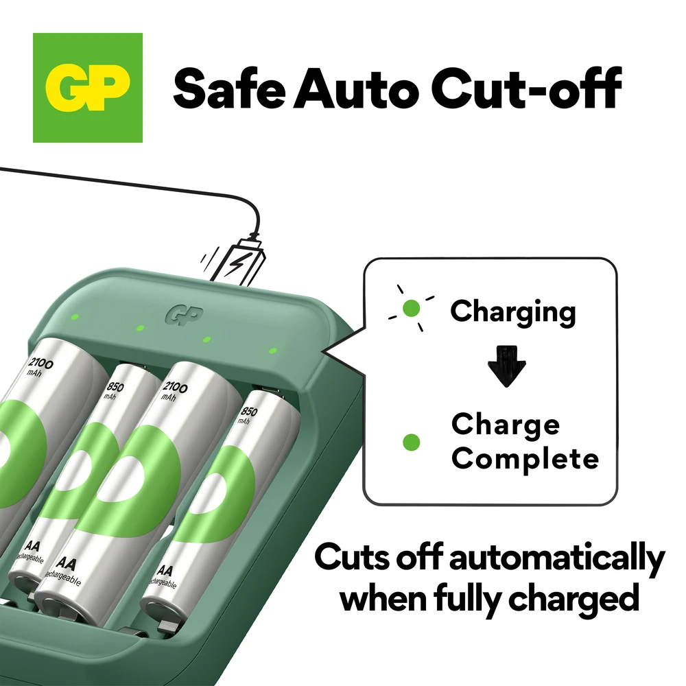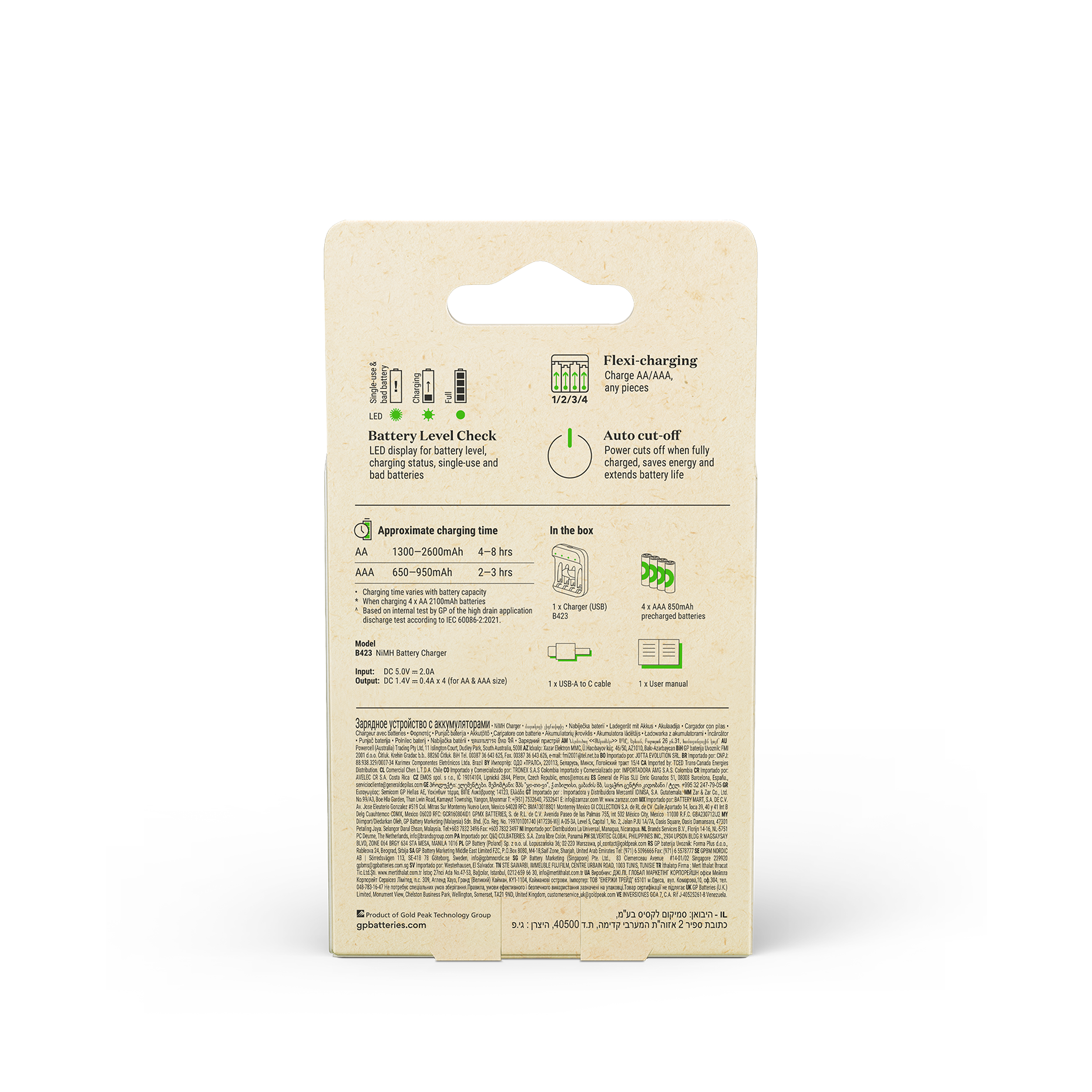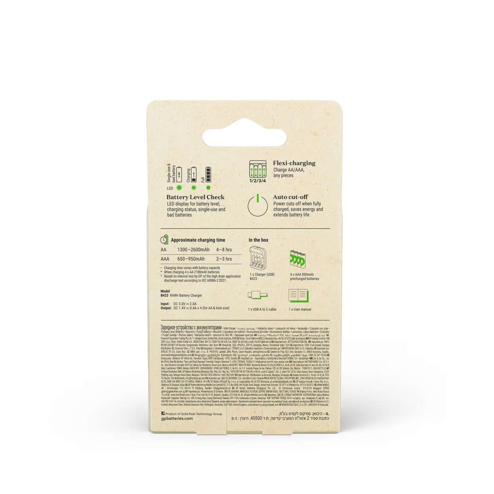 B423 lataa AA/AAA -akkut noin 6 tunnissa USB-C -liitännän kautta. LED-merkkivalot näyttävät latauksen tilan ja jos laturiin on asetettu kertakäyttöisiä paristoja tai viallisia akkuja. Toinen turvaominaisuus on automaattinen virrankatkaisuajastin ja täyden latauksen -dV-tunnistus, joka auttaa välttämään ylilatausta, ylijännitettä ja oikosulkua sekä estämään akkujen vioittumista. Mukana on neljä ladattavaa AAA 850mAh-akkua täydentämässä optimaalista latausratkaisua.