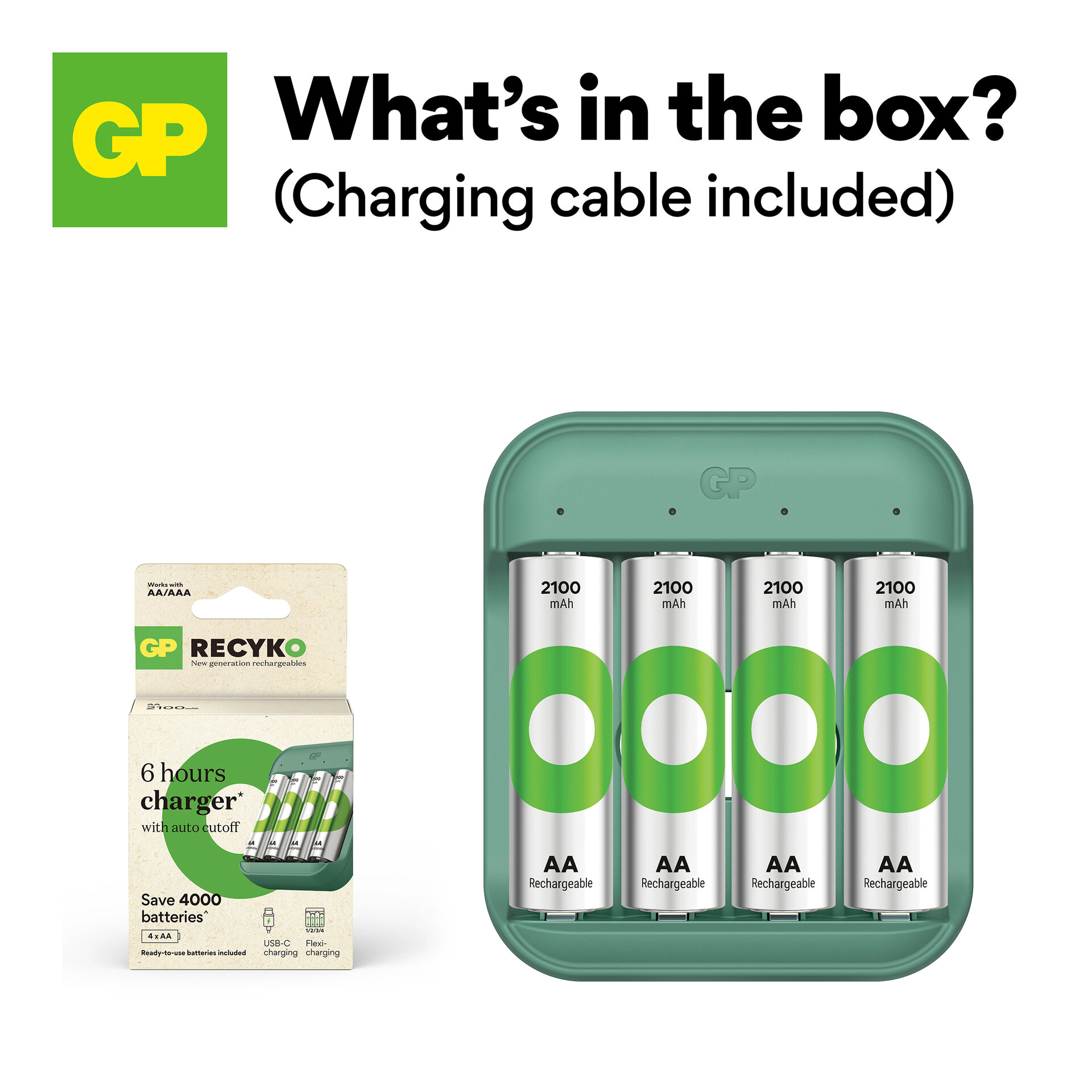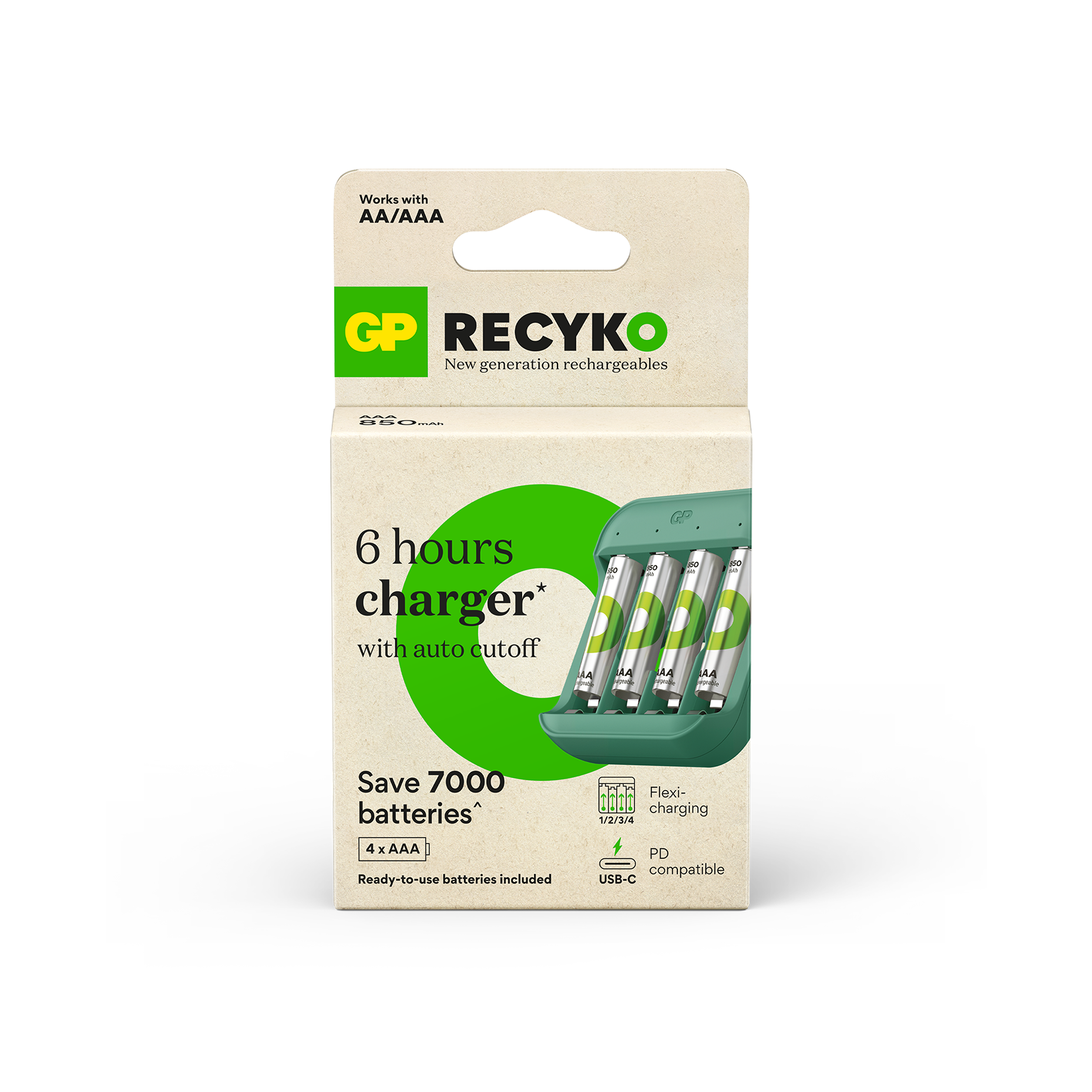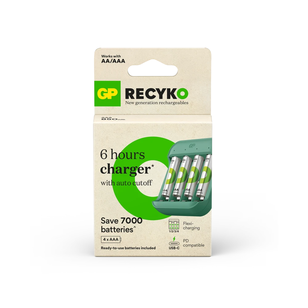 Lataa 6 tunnissa – Älykäs ja kompakti laturi, joka lataa jopa neljä AA- tai AAA-akkua nopeasti vain 6 tunnissa USB-C-liitännällä.