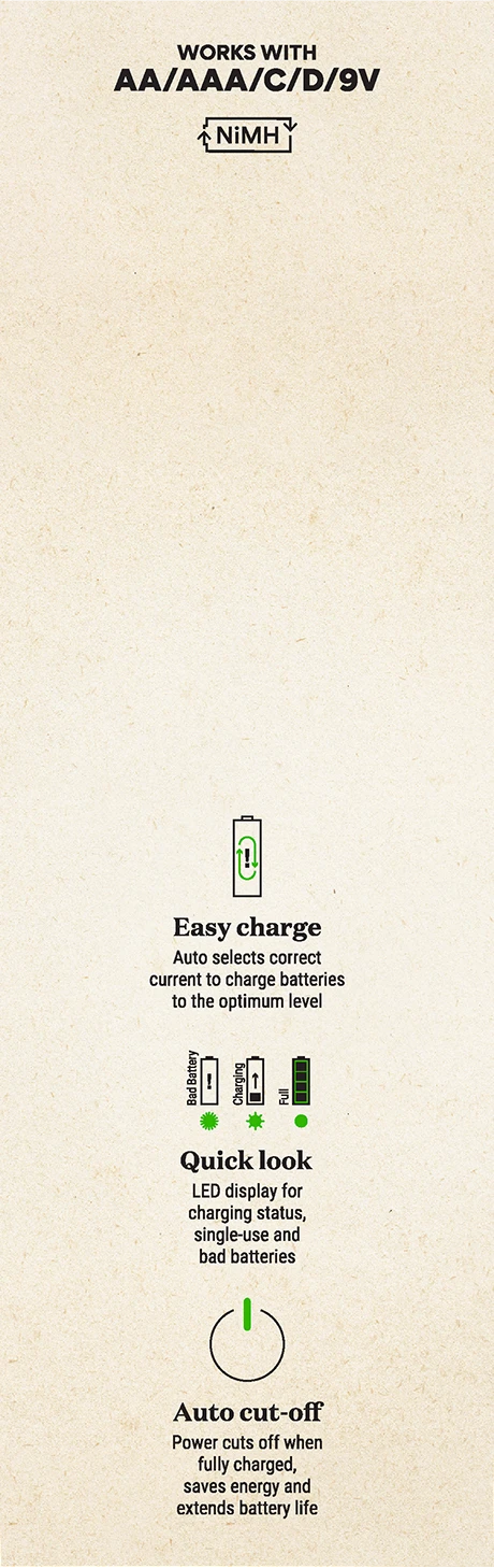 - AAA, AA, C, D ja 9V NiMH-akkujen lataamiseen