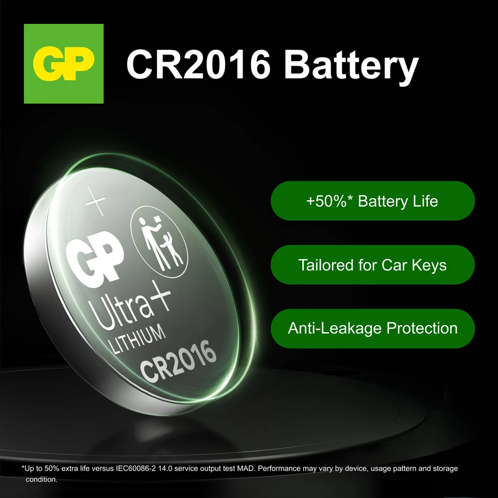 GP Ultra Plus Litium CR2016 tarjoaa luotettavaa tehoa ja jopa 50 % pidemmän käyttöiän.* Tämä autonavaimille optimoitu paristo varmistaa sujuvan käytön ja pitkän kantaman lukituksen avauksessa aina kun sitä tarvitset.
