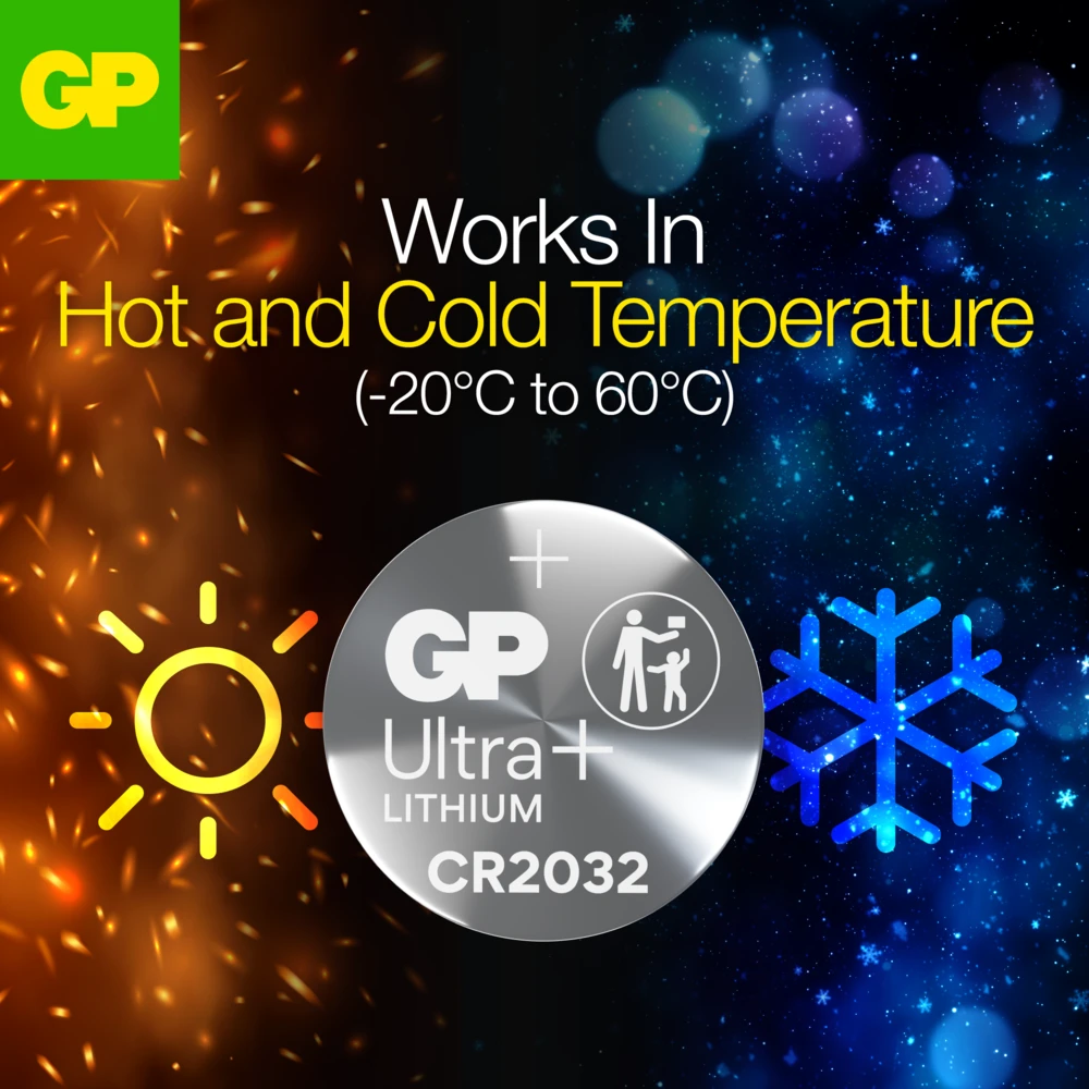 Luotettava toiminta ääriolosuhteissa – GP Ultra Plus CR2032 litiumnappiparisto toimii luotettavasti -20 °C – +60 °C lämpötiloissa, sopii hyvin myös ulkokäyttöön.