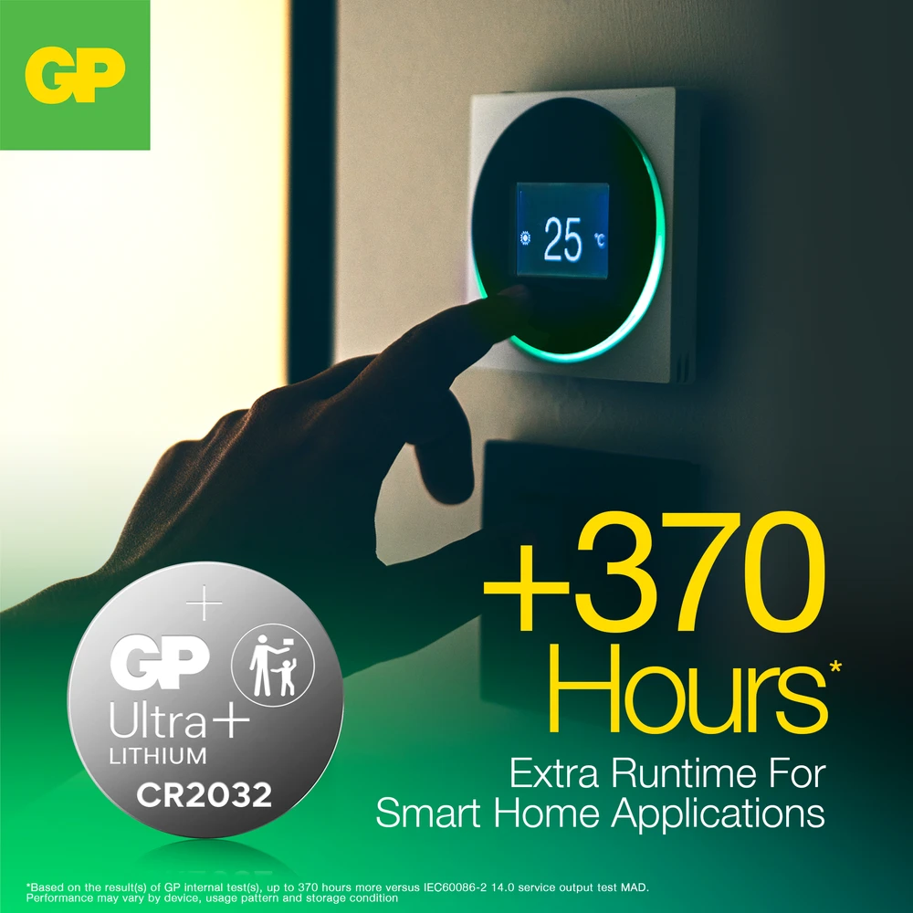 Pidempi käyttöaika älykoti- ja IoT-laitteille – Älykkäät kotijärjestelmät ja IoT-laitteet vaativat jatkuvaa virtaa saumattoman yhteyden varmistamiseksi. GP Ultra Plus CR2032 litiumparistot tarjoavat jopa 370 lisätuntia** käyttöaikaa sensoreille, älylukoille ja muille älykotilaitteille.