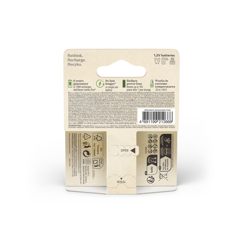 Ladattava NiMH AAA-akku, joka kuormittaa ympäristöä ja lompakkoasi vähemmän. Akut ovat esiladattuja ja käyttövalmiita suoraan pakkauksesta ja voivat säilyttää jopa 70 % latauksesta 12 kuukauden jälkeen alhaisen itsepurkautumisnopeuden ansiosta. Akkujen käyttölämpötila on -20 °C:n ja +50 °C:n välillä, joten ne toimivat luotettavasti myös äärimmäisissä olosuhteissa. Akkujen valmistuksessa on käytetty yli 10 % kierrätysmateriaaleja ja yli 90 % akusta, mukaan lukien koko pakkaus, voidaan kierrättää uudelleen.