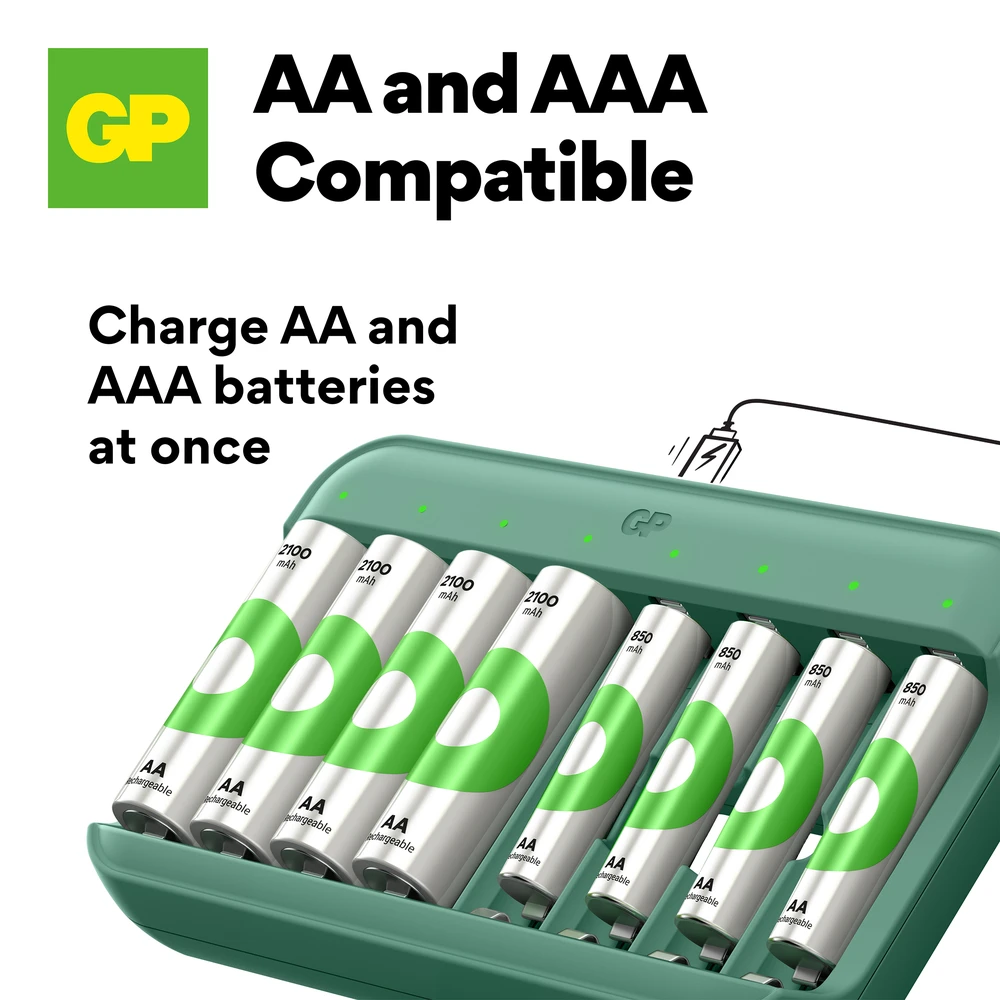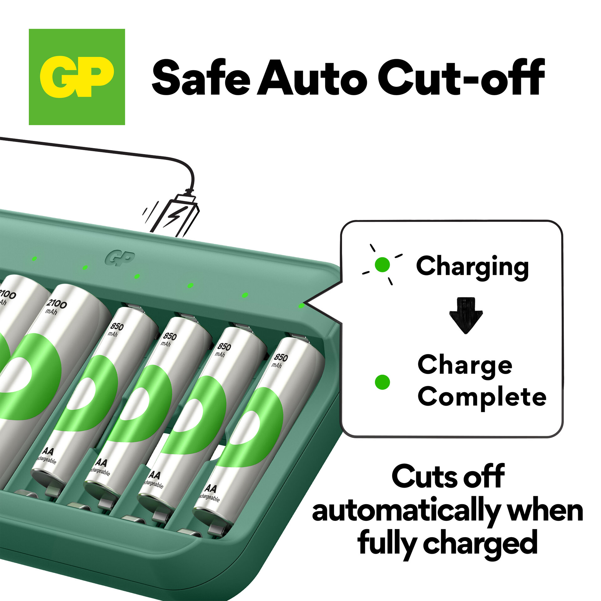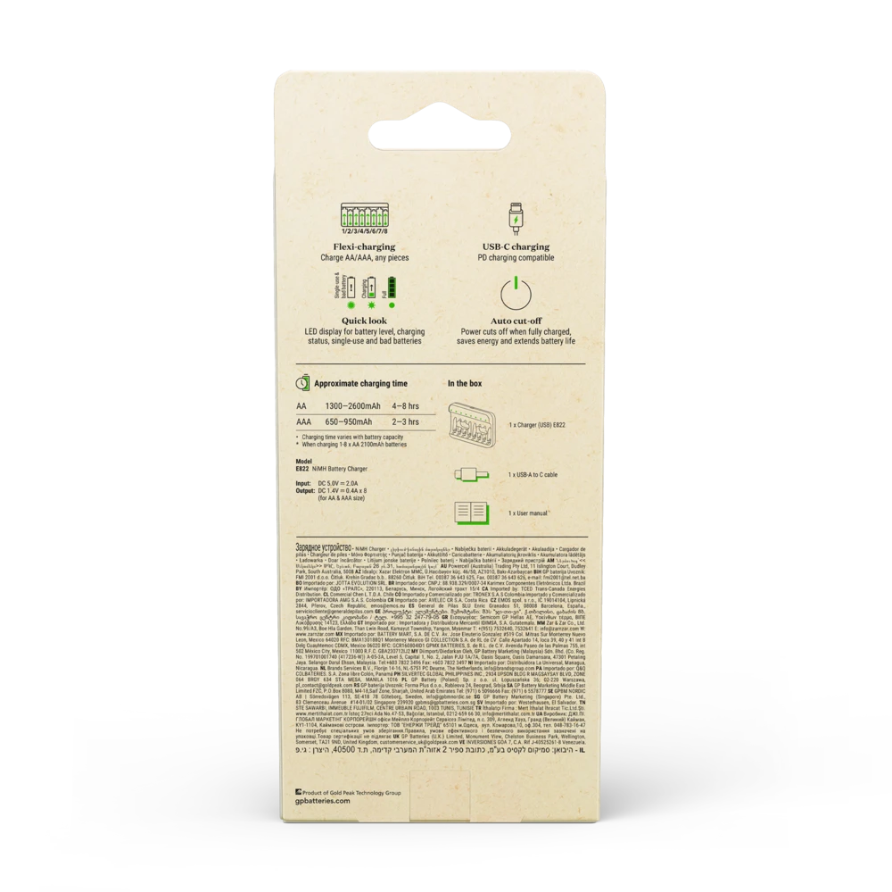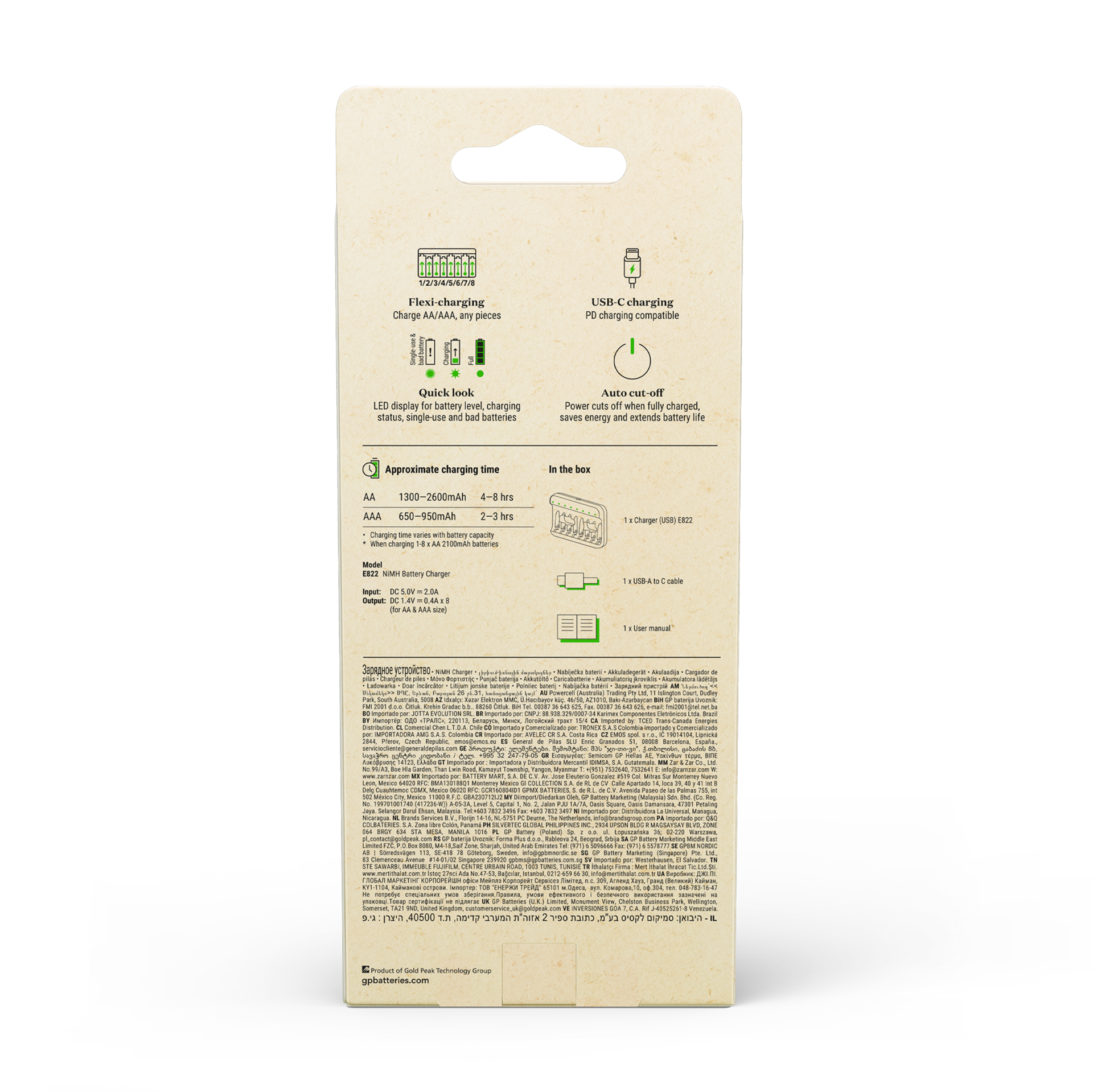 E822 on edullinen akkulaturi, joka voi ladata jopa kahdeksan AA- tai AAA samaan aikaan. LED-merkkivalot osoittavat lataustilan, akkujen varaustason ja sen, onko laturiin asetettu kertakäyttöinen paristo tai huono akku. Turva-ajastin sammuttaa laturin, kun akut on ladattu täyteen. Tämä estää ylilatauksen, ylivirran ja oikosulun ja parantaa akkujen käyttöikää. Laturi on varustettu USB-portilla, joka on tunnustettu turvallisimmaksi virransyöttöportiksi kulutuselektroniikan tuotteissa. Tämä akkulaturi toimitetaan ilman akkuja, osta tarpeisiisi parhaiten sopivat GP-akut.