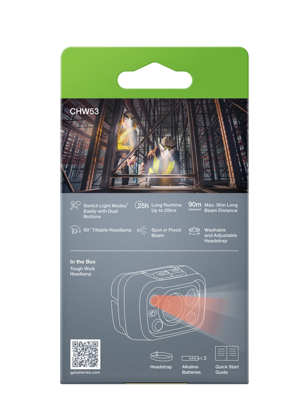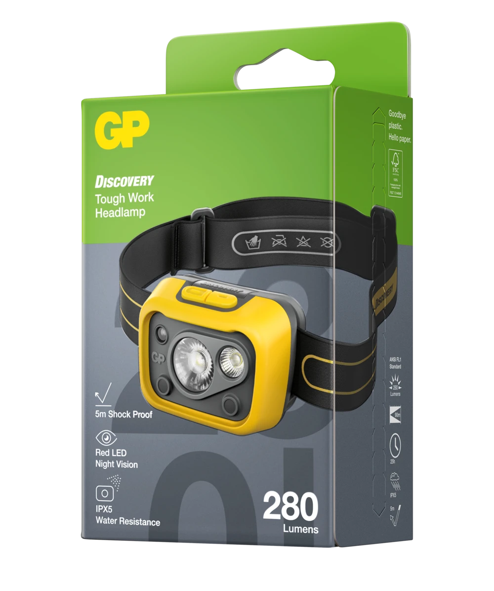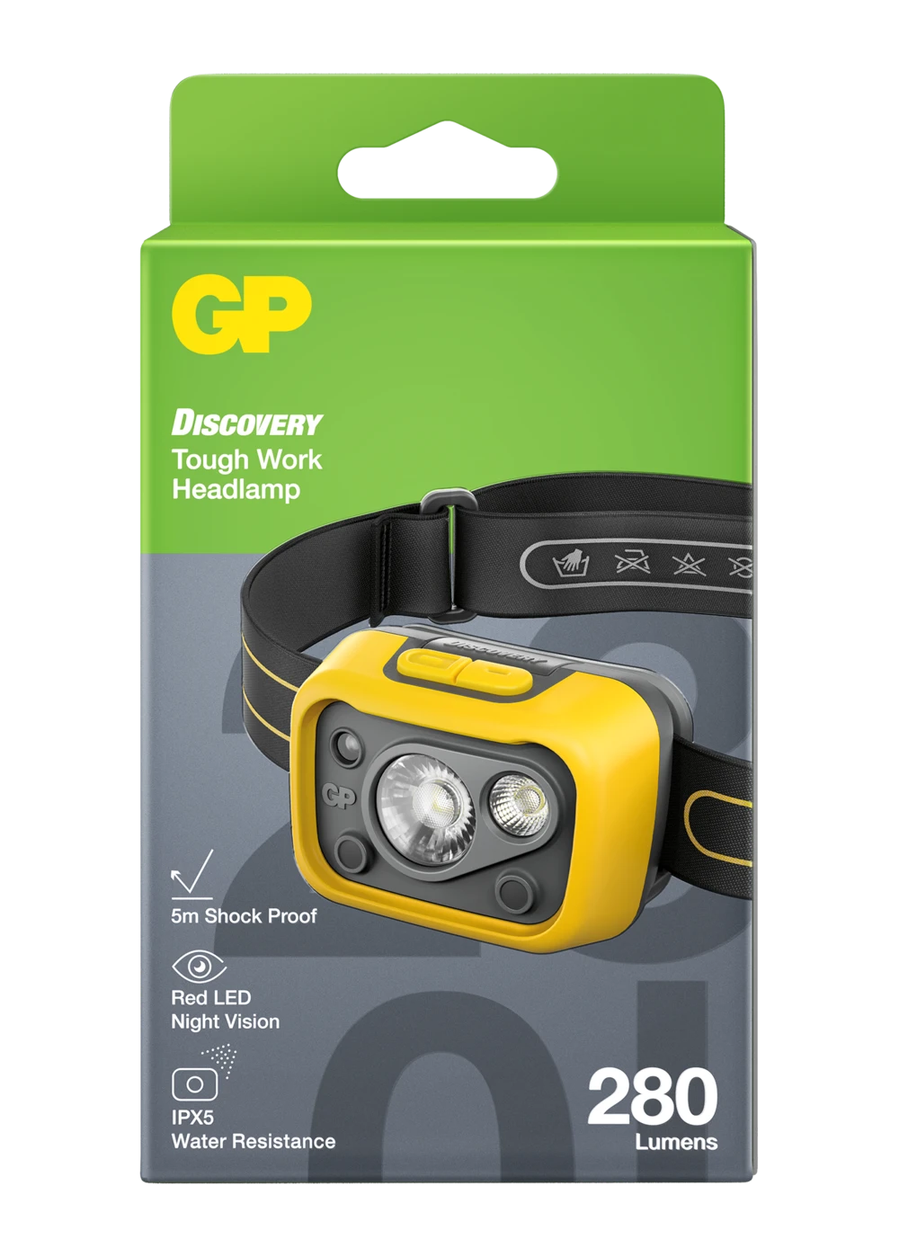 GP Discovery Work CHW53 -otsalamppu on suunniteltu niille, jotka eivät anna pimeyden pysäyttää työtään tai tee-se-itse-projektejaan. Lampun kirkkaus on jopa 280 lumenia ja siinä on 6 eri valotilaa, mukaan lukien SOS sekä punainen LED-valo hämäränäköä varten. GP Discovery Work CHW53 on yksi lujimmista ja kestävimmistä otsalampuistamme, se kestää pudotuksia jopa 5 metrin korkeudesta ja on vedenkestävyydeltään IPX5-luokiteltu. Leveä pääpanta on konepestävä ja helposti säädettävissä maksimaalista mukavuutta varten. Otsalamppu on yhteensopiva sekä kertakäyttöisten paristojen että ladattavien (NiMH) akkujen kanssa, joten se on kätevä monitoimivalo joka lähtöön.