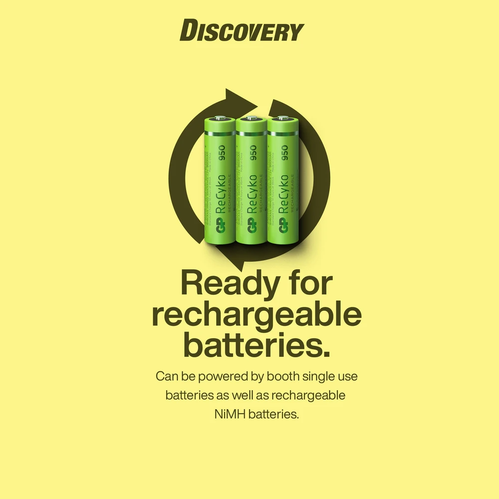 Tämä otsalamppu on yhteensopiva sekä kertakäyttöisten paristojen että ladattavien (NiMH) akkujen kanssa. Suojapiiri estää ladattavien akkujen ylipurkauksen ja hyödyntää siten akkujen koko elinkaaren. Valitsemalla ladattavat akut otsalamppuusi pienennät hiilijalanjälkeäsi ja vähennät kertakäyttöparistojen aiheuttamaa jätettä.