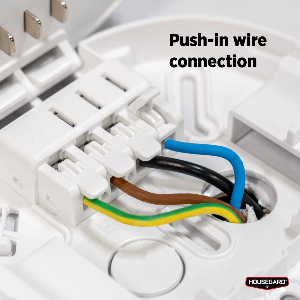 Varoitin voidaan asentaa johtolähdön päälle, kattorasian yhteyteen tai pinta-asennettuna. Push-in-liittimet ja irrotettava asennuspohja nopeuttavat työtä. Rakennusvaiheen aikana pohja voidaan suojata mukana tulevalla pöly- ja likasuojalla, ja tilan valmistuttua varoitin napsautetaan paikalleen ilman työkaluja.